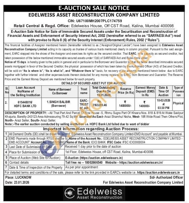 DESCRIPTION OF PROPERTY: -All That Part And Parcel Of Row House -5, Rhmu Sugra Part Of Khasra Nos. 818 & 819 At Wake Saidpur Khajuria, Bareilly-243123 Area Admeasuring 79.42 Sq Mtr. Bounded As East-Arazi Shamhul Nisha, West-18ft Wide Road Then Others Plot, North- Arazi Seller, South- Arazi Seller. Note::-The earlier auction conducted by selling institution i.e. HDFC Bank Ltd failed due to want of bidder