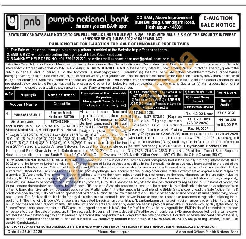 All part and parcel of land and superstructure built thereon in Plot No. 148 measuring 2200 no 97/112 Khasra No. 4//10/ (0-4), 11/1 (3-14), 5//6/2 (5-2)7(3-4),8(0-8) 12/2(3-18), 13(7-14), 14(8-0),15/1 (6-18), 16/4(0-3), 17/1 (1-16) 18 8-0),19 (8-0),21/2(6-0), 22(8-0), 23(8-0),11//5/2(5-12), 6/1 (7-10), 26(0-6),12/11(8-0),2(7-14), 3(8-0),10(8-0), 10(8-0), 26(0-7) as per Jamabandi for the year 2011-12 and situated at Village Naloyan, Hadbast No. 225, registered in the name of Smt. Kiran Jain vide Sale deed dated 05.02.2014, Document No. 7326, Zild No. 3833, Page No. 26 at the office of Sub-Registrar Hoshiarpur and boundedas: East: Rasta (44'-0"), West: Other Owners (44'-0"), North: Other Owners (50-0'), South: Other Owners (50-0").