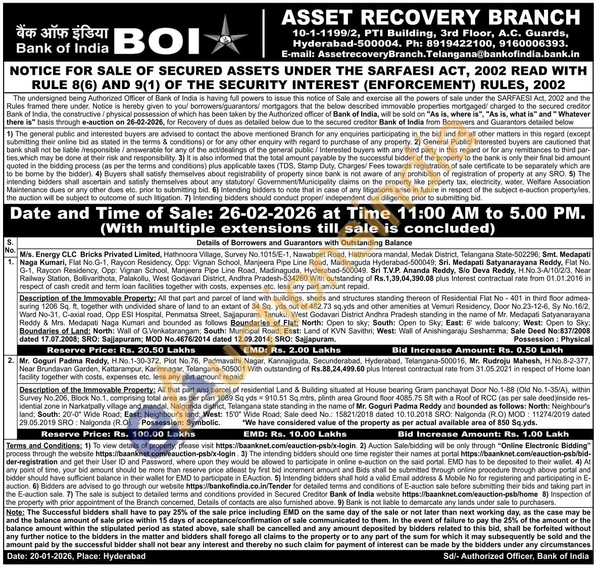 Description of the Immovable Property: All that part and parcel of residential Land & Building situated at House bearing Gram panchayat Door No.1-88 (Old No.1-35/A), within Survey No.206, Block No. 1, comprising total area as per plan 1089 Sq yds = 910.51 Sq.mtrs, plinth area Ground floor 4085.75 Sft with a Roof of RCC (as per sale deed)inside res-idential zone in Narkatpally village and mandal, Nalgonda district, Telangana state standing in the name of Mr. Goguri Padma Reddy and bounded as follows: North: Neighbour's land; South: 20'-0" Wide Road; East: Neighbour's land; West: 15'0" Wide Road; Sale deed No.: 15821/2018 dated 10.10.2018 SRO: Nalgonda (R.O) MOD: 11274/2019 dated 29.05.2019 SRO: Nalgonda (R.O). Possession: Symbolic. *We have considered value of the property as per actual available area of 850 Sq.yds