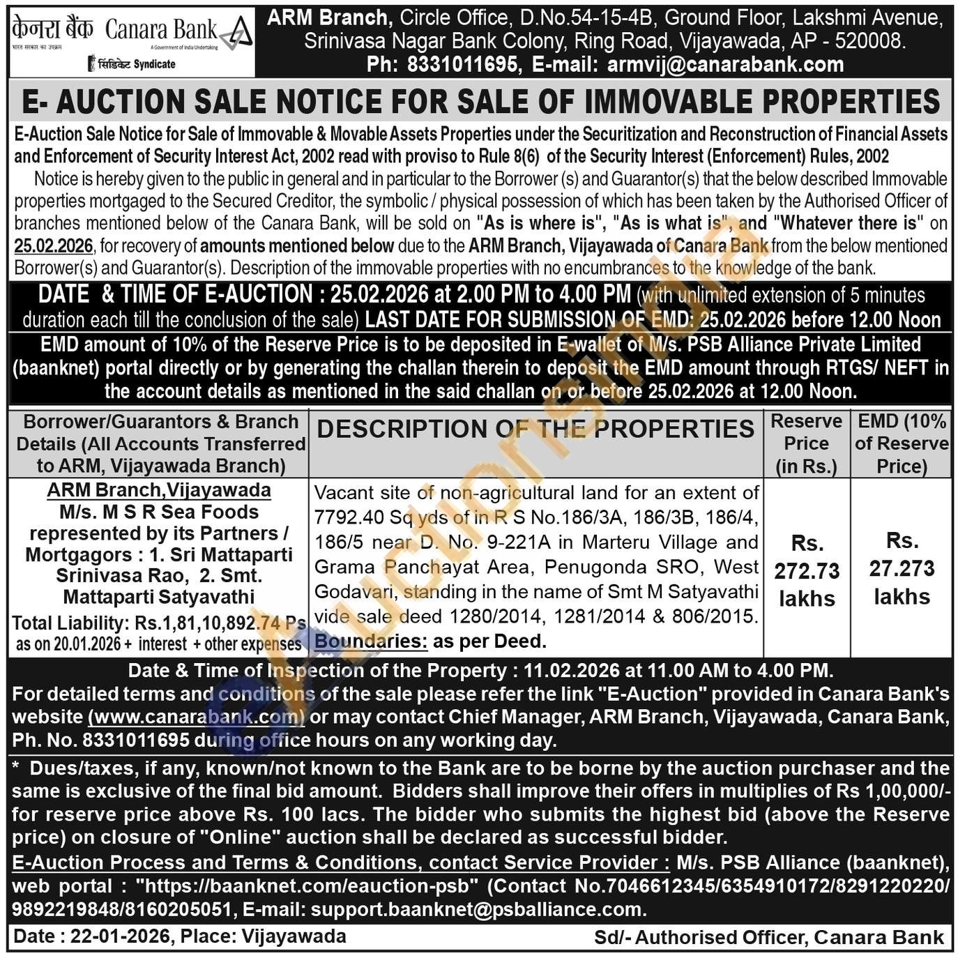 Vacant site of non-agricultural land for an extent of 7792.40 Sq yds of in R S No. 186/3A, 186/3B, 186/4, 186/5 near D. No. 9-221A in Marteru Village and Grama Panchayat Area, Penugonda SRO, West Godavari, standing in the name of Smt M Satyavathi vide sale deed 1280/2014, 1281/2014 & 806/2015. Boundaries: as per Deed