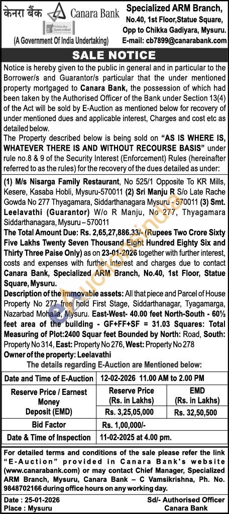 Description of the immovable assets: All that piece and Parcel of House Property No 277 free hold First Stage, Siddarthanagar, Tyagamarga, Nazarbad Mohalla, Mysuru. East-West- 40.00 feet North-South - 60/2 feet area of the building GF+FF+SF = 31.03 Squares: Total Measuring of Plot:2400 Squar feet Bounded by North: Road, South: Property No 314, East: Property No 276, West: Property No 278