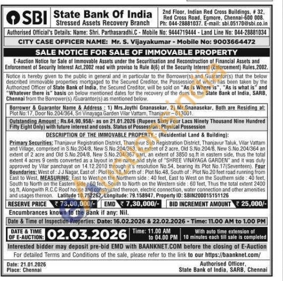 Primary Securities: Thanjavur Registration District, Thanjavur Sub Registration District, Thanjavur Taluk, Vilar Vattam and Village, comprised in S.No.204/8, New S.No.204/363, an extent of 2 acre, Old S.No 204/8, New S.No.204/364 an extent of 2 acre and Old S.No.204/8, New S.No.204/367 part, an extent of 3850 sq.ft in eastern side, thus the total extent 4 acres 9 cents converted as a layout in the name and style of "SHREE VINAYAGA GARDEN" and it was duly approved by Vilar panchayat on 14.12.2010 through it's resolution No.54, bearing its Plot No.17(Seventeen), Four Boundaries: West of: JJ Nagar, East of: Plot No. 18, North of: Plot No.48, South of: Plot No.20 feet road running from East to West, MEASURING: East to West on the Northern side: 40 feet, East to West on the Southern side: 40 feet, South to North on the Eastern side: 60 feet, South to North on the Western side: 60 feet, Thus the total extent 2400 sq.ft, Alongwith R.C.C Roof house and constructed thereon, electric connection, water connection and other amenities and usages thereon. Latitude 10.752262, Longitude: 79.158947, Property ID: SBIN200015151126