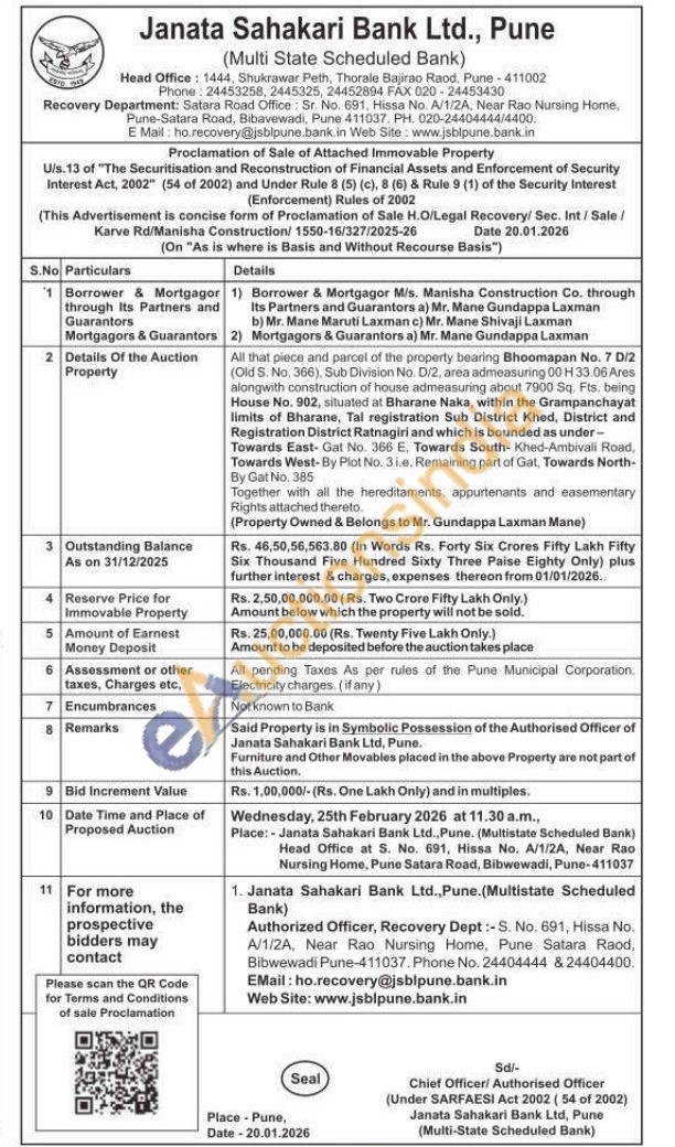 All that piece and parcel of the property bearing Bhoomapan No. 7 D/2 (Old S. No. 366), Sub Division No. D/2, area admeasuring 00 H 33.06 Ares alongwith construction of house admeasuring about 7900 Sq. Fts, being House No. 902, situated at Bharane Naka, within the Grampanchayat limits of Bharane, Tal registration Sub District Khed, District and Registration District Ratnagiri and which is bounded as under- Towards East-Gat No. 366 E, Towards South Khed-Ambivali Road, Towards West-By Plot No. 3 i.e. Remaining part of Gat, Towards North-By Gat No. 385 Together with all the hereditaments, appurtenants and easementary Rights attached thereto. (Property Owned & Belongs to Mr. Gundappa Laxman Mane)