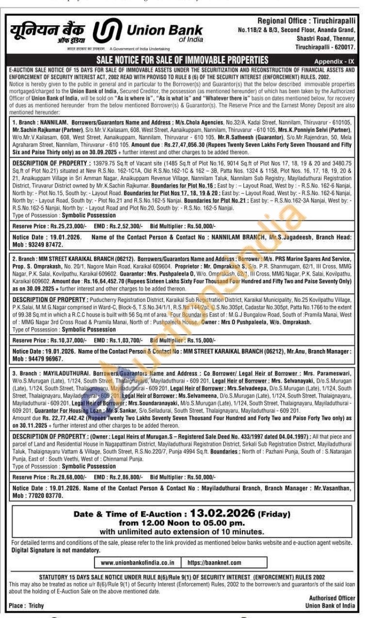 DESCRIPTION OF PROPERTY: (Owner: Legal Heirs of Murugan.S-Registered Sale Deed No. 433/1997 dated 04.04.1997): All that piece and parcel of Land and Residential House in Nagapattinam District, Mayiladuthural Registration District, Sirkali Sub Registration District, Mayiladuthurai Taluk, Thalaignayaru Vattam & Village, South Street, R.S.No.220/7, Punja 4994 Sq.ft. Boundaries: North of: Pazhani Punja, South of: S. Natarajan Punja, East of South Veethi, West of: Chinnamal Punja Type of Possession Symbolic Possession
