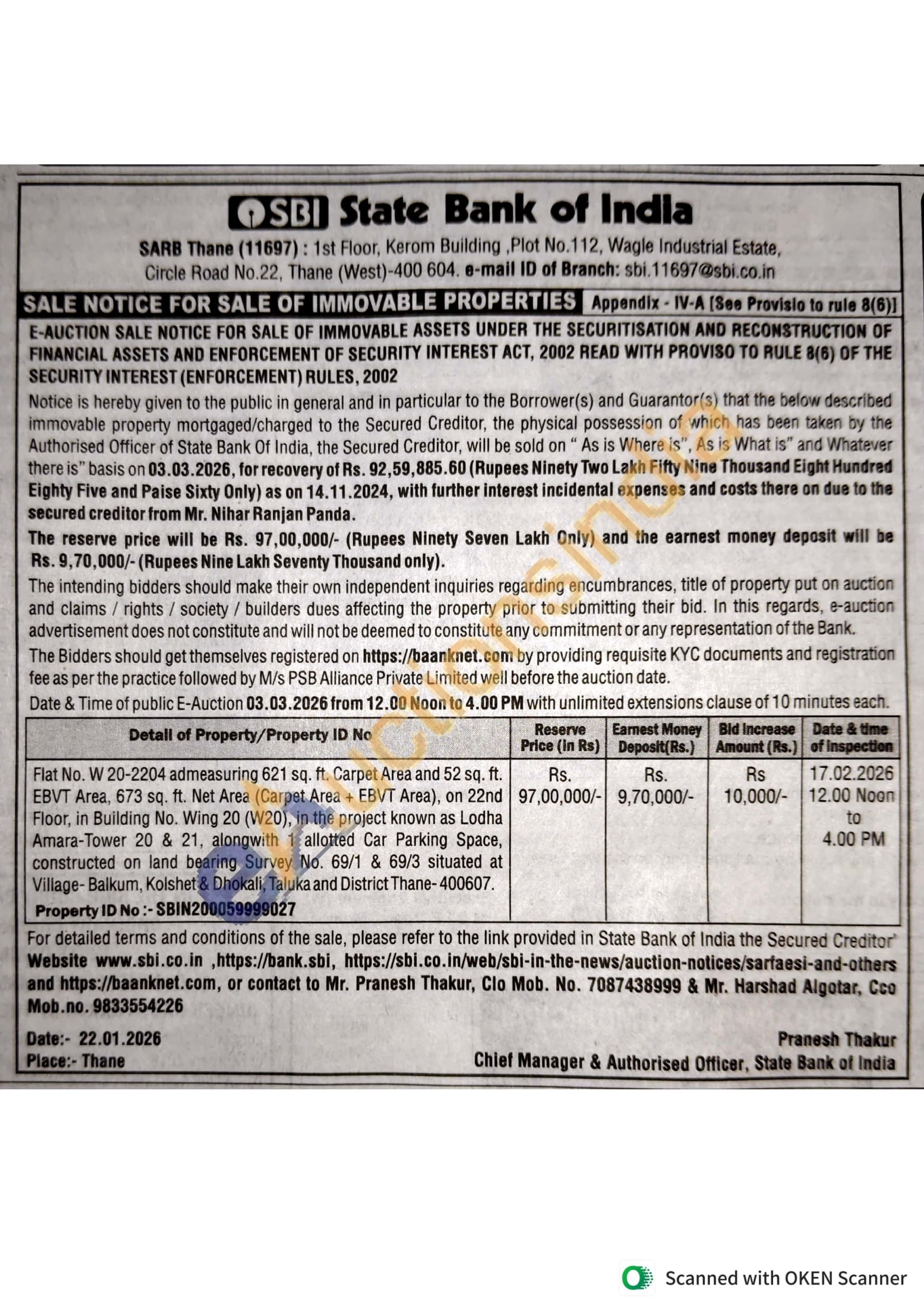 Flat No. W 20-2204 admeasuring 621 sq. ft. Carpet Area and 52 sq. ft. EBVT Area, 673 sq. ft. Net Area (Carpet Area + EBVT Area), on 22nd Floor, in Building No. Wing 20 (W20), in the project known as Lodha Amara-Tower 20 & 21, alongwith 1 allotted Car Parking Space, constructed on land bearing Survey No. 69/1 & 69/3 situated at Village-Balkum, Kolshet & Dhokali, Taluka and District Thane-400607. Property ID No:- SBIN200059999027