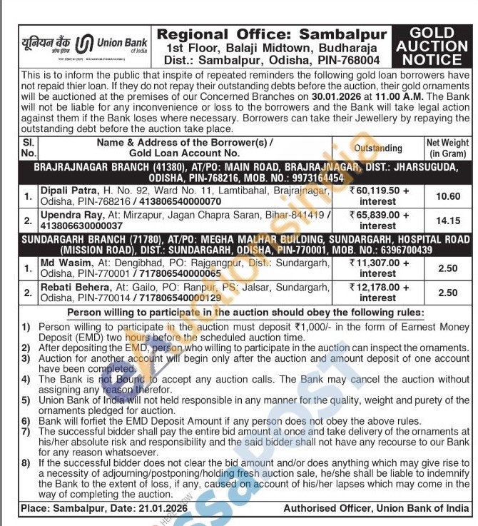 Union Bank of India Gold Auctions Auction in Sambalpur