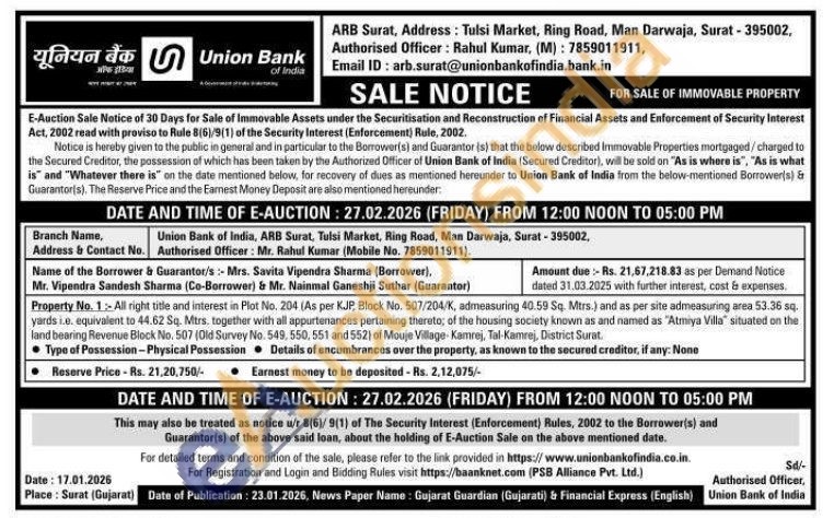Property No. 1:- All right title and interest in Plot No. 204 (As per KJP, Block No. 507/204/K, admeasuring 40.59 Sq. Mtrs.) and as per site admeasuring area 53.36 sq. yards i.e. equivalent to 44.62 Sq. Mtrs, together with all appurtenances pertaining thereto; of the housing society known as and named as "Atmiya Villa situated on the land bearing Revenue Block No. 507 (Old Survey No. 549, 550, 551 and 552) of Mouje Village Kamrej, Tal-Kamraj, District Surat