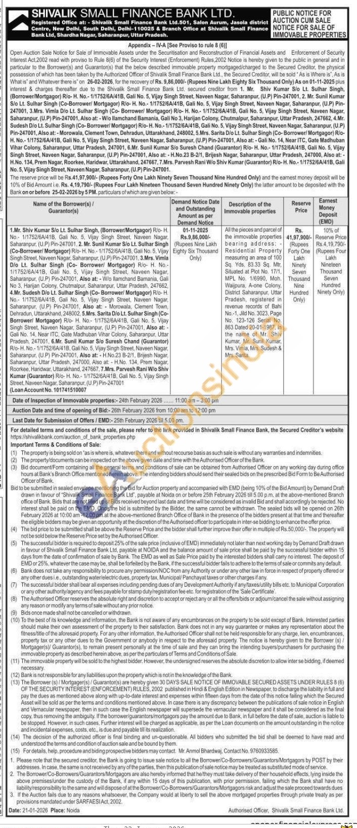 1.Mr. Shiv Kumar S/o Lt. Sulhar Singh, (Borrower/Mortgagor) Rio-H. No.- 1/1752/6A/41B, Gall No. 5. Vijay Singh Street, Naveen Nagar, Saharanpur, (U.P) Pin-247001, 2. Mr. Sunil Kumar S/o Lt. Sulhar Singh (Co-Borrower/ Mortgagor) R/o-H. No.-1/1752/6A/41B, Gali No. 5. Vijay Singh Street, Naveen Nagar, Saharanpur, (U.P) Pin-247001, 3.Mrs. Vimla D/o Lt. Sulhar Singh (Co- Borrower/ Mortgagor) Rio- H. No-1/1752/6A/41B, Gali No. 5, Vijay Singh Street, Naveen Nagar, Saharanpur, (U.P) Pin-247001, Also at: Wlo llamchand Bamania, Gali No 3. Harijan Colony, Chutmalpur, Saharanpur, Uttar Pradesh, 247662, 4.Mr. Sudesh D/o Lt. Sulhar Singh (Co-Borrower/ Mortgagor) Rio-H. No.- 1/1752/6A/418, Gali No. 5, Vijay Singh Street, Naveen Nagar, Saharanpur, (UP) Pin-247001, Also at: Morowala, Clement Town, Dehradun, Uttarakhand, 248002, 5.Mrs. Sarita Dio Lt. Sulhar Singh (Co-Borrower/ Mortgagor) R/o- H. No-1/1752/6A/418, Gali No. 5. Vijay Singh Street, Naveen Nagar, Saharanpur, (U.P) Pin-247001, Also at:-Gali No. 14. Near ITC, Gate Madhuban Vihar Colony, Saharanpur, Uttar Pradesh, 247001, 6.Mr. Sunil Kumar Sio Suresh Chand (Guarantor) Rio-H. No.-1/1752/6A/41B, Gali No. 5, Vijay Singh Street, Naveen Nagar, Saharanpur, (U.P) Pin-247001, Also at:-H.No.23 8-2/1, Brijesh Nagar, Saharanpur, Uttar Pradesh, 247000, Also at H.No. 134, Prem Nagar, Roorkee, Haridwar, Uttarakhand, 247667, 7.Mrs. Parvesh Rani Wio Shiv Kumar (Guarantor) Rio- H. No. 1/1752/6A/418, Gall No. 5, Vijay Singh Street. Naveen Nagar, Saharanpur, (U.P) Pin-247001 (Loan Account No. 101741510007