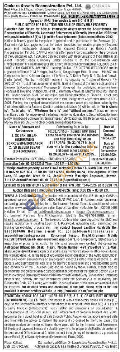 Description of the property: Akash Tina Apartment, Flat No 2 C, North Side, 2nd Floor, LR DAG No 876, 894, LR KH No. 1087 & 534, Holding No 64, Uttar Jagacha, 1st Bye Lane, PS Jagacha, Ward No 47, Under Howrah Municipal Corporate, Howrah-711112. Area of Residential Unit: 731 Sq.ft (Super Built up area)