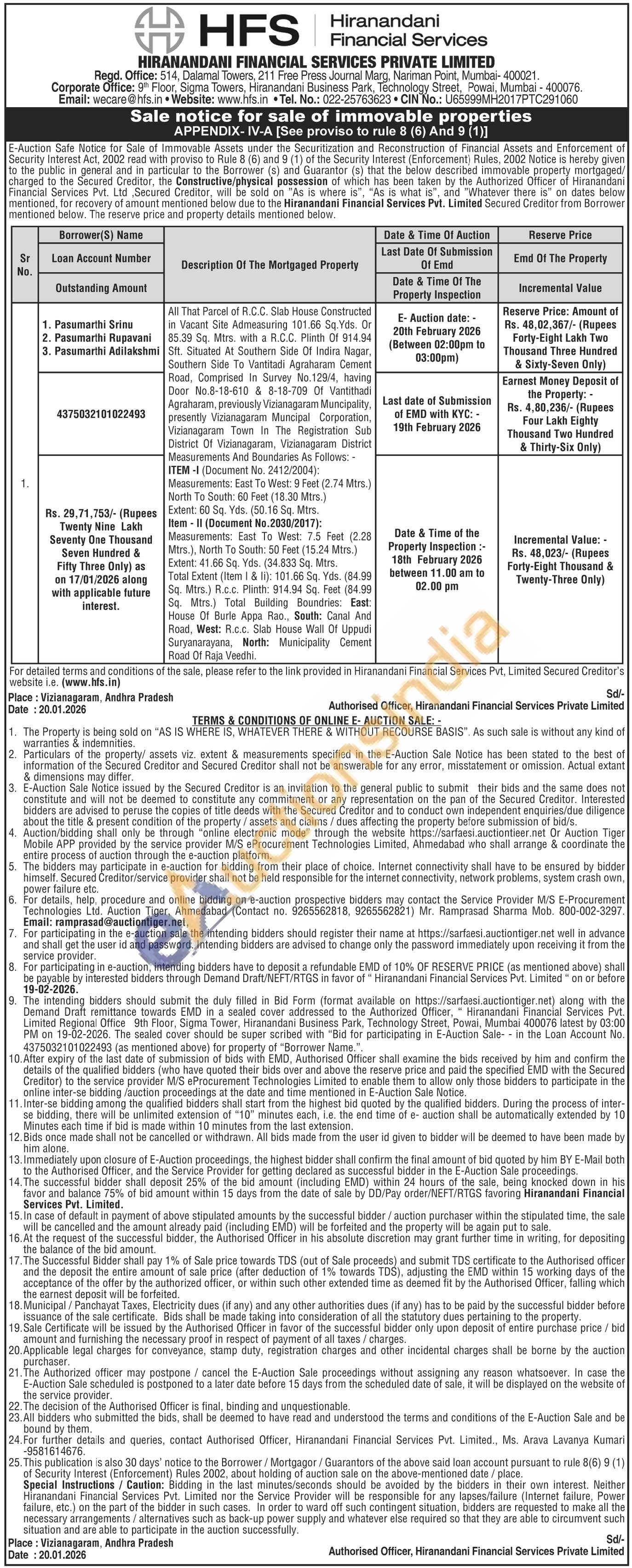All That Parcel of R.C.C. Slab House Constructed in Vacant Site Admeasuring 101.66 Sq. Yds. Or 85.39 Sq. Mtrs. with a R.C.C. Plinth Of 914.94 Sft. Situated At Southern Side Of Indira Nagar, Southern Side To Vantitadi Agraharam Cement Road, Comprised In Survey No.129/4, having Door No.8-18-610 & 8-18-709 Of Vantithadi Agraharam, previously Vizianagaram Muncipality, presently Vizianagaram Muncipal Corporation, Vizianagaram Town In The Registration Sub District Of Vizianagaram, Vizianagaram District Measurements And Boundaries As Follows: -ITEM -1 (Document No. 2412/2004): Measurements: East To West: 9 Feet (2.74 Mtrs.) North To South: 60 Feet (18.30 Mtrs.) Extent: 60 Sq. Yds. (50.16 Sq. Mtrs. Item II (Document No.2030/2017): Measurements: East To West: 7.5 Feet (2.28 Mtrs.), North To South: 50 Feet (15.24 Mtrs.) Extent: 41.66 Sq. Yds. (34.833 Sq. Mtrs. Total Extent (Item I & li): 101.66 Sq. Yds. (84.99 Sq. Mtrs.) R.c.c. Plinth: 914.94 Sq. Feet (84.99 Sq. Mtrs.) Total Building Boundries: East: House Of Burle Appa Rao., South: Canal And Road, West: R.c.c. Slab House Wall Of Uppudi Suryanarayana, North: Municipality Cement Road Of Raja Veedhi.