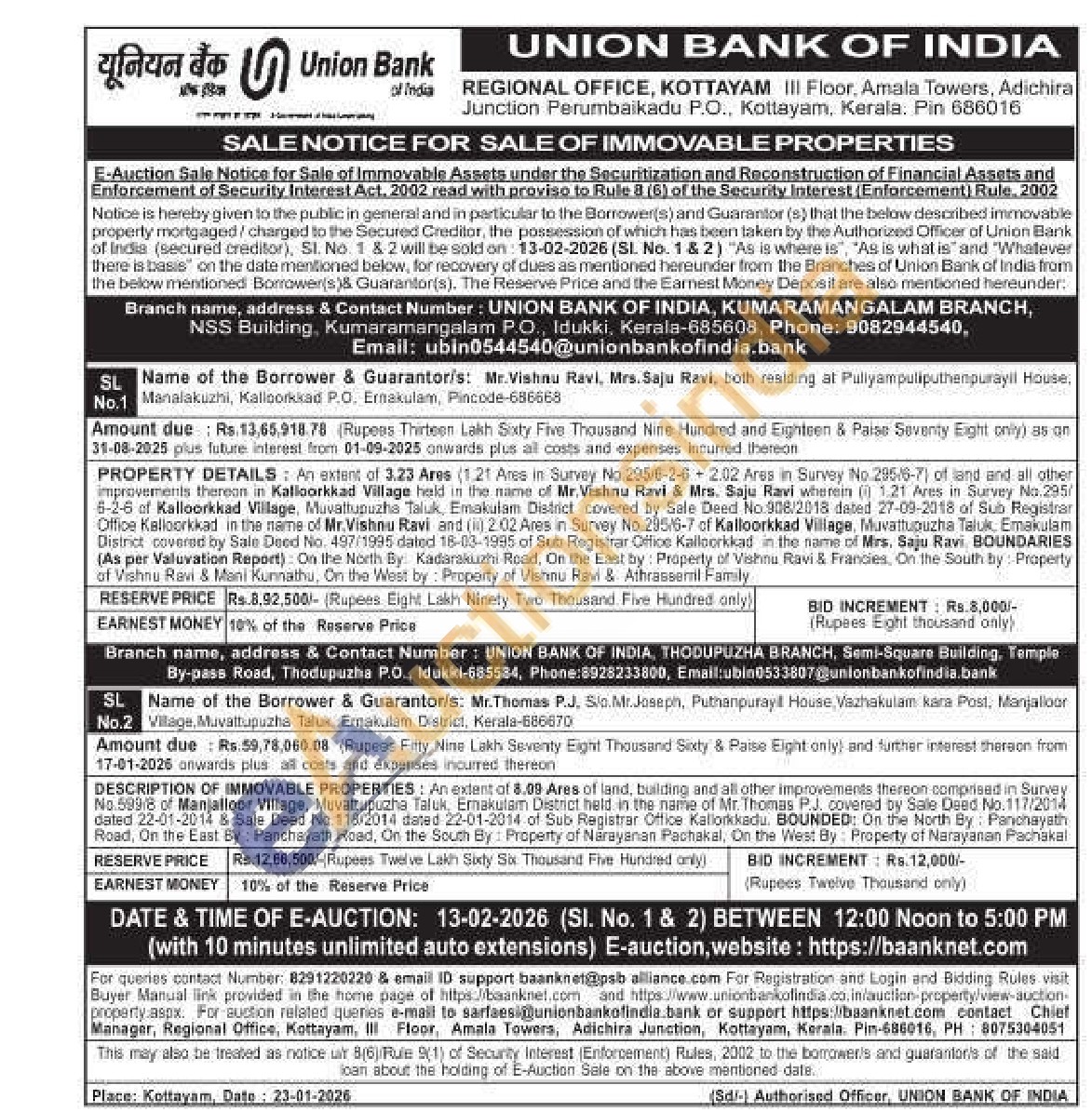 DESCRIPTION OF IMMOVABLE PROPERTIES: An extent of 8.09 Ares of land, building and all other improvements thereon comprised in Survey No.599/8 of Manjalloor Village, Muvattupuzha Taluk, Ernakulam District held in the name of Mr. Thomas P.J. covered by Sale Dead No.117/2014 dated 22-01-2014 & Sale Deed No. 118/2014 dated 22-01-2014 of Sub Registrar Office Kaliorkkadu. BOUNDED: On the North By: Panchayath Road, On the East By: Panchayath Road, On the South By: Property of Narayanan Pachakal, On the West By: Property of Narayanan Pachakal