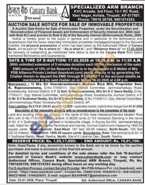 Land and building (Rice mill building in the name of Mis Sree Veerabramhendra Modern Rice Mill) with D No. 17-9-04/B4 to an extent: 0.38250 cents (0.153 hectares) Standing in the name of Sri. K V Sudhakar Reddy, situated in Koilakuntla village, in Survey No 434, Jammaiamadugu road, Ward No. 16, Kovelakuntia Panchayat and mandal, Kurnool District and measuring 1855.55 square yards. Measurements: East-West: 167 feet (50.65 meters), North-South: 100 feet (30.33 meters), Total Extent: 1855.55 square yards. Boundaries: East: Site belonging to Sri. K V Sudhakar Reddy, West: Rastha, North: Site of K Lakshmi Devi, South: Rastha.