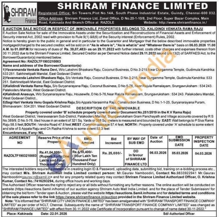 West Godavari District, Veeravasaram Sub-District, Palakoderu Mandal, Srungavruksham Gram Panchayath and Village accounts covered by RS No.389/9, D No. 5-76, tiled house in an extent of 321 Sq. Yards or 268 Sq. meters is measured and bounded by: EAST: Wall belongs to P Siva Rama Raju 58.5 feet, SOUTH: Vendra Road 47.8 feet, WEST:Common passage 57.4 feet, NORTH: Property covered under 'A' schedule to some extent and site of S Appala Raju and Ch Radha Krishna to some extent 52.3 feet