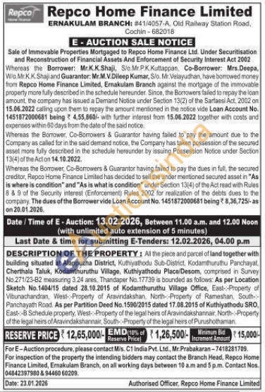 DESCRIPTION OF THE PROPERTY: Al the piece and parcel of land together with building situated at Alappuzha District, Kuthiyathodu Sub-District, Kodamthuruthu Panchayat. Cherthala Taluk, Kodamthuruthu Village, Kuthiyathodu Place/Desom, comprised in Survey No.271/23-82 measuring 3.24 ares, Thandaper No.17739 is bounded as follows: As per Location Sketch No.1404/15 dated 28.10.2015 of Kodamthuruthu Village Office, East-Property of Vibunachandran, West-Property of Aravindakshan, North-Property of Rameshan, South Panchayath Road. As per Partition Deed No. 1590/2015 dated 17.08.2015 of Kuthiyathodu SRO. East--B Schedule property, West-:-Property of the legal heirs of Aravindakshannar, North-Property of the legal heirs of Aravindakshannair, South-:-Property of the legal heirs of Purushothaman