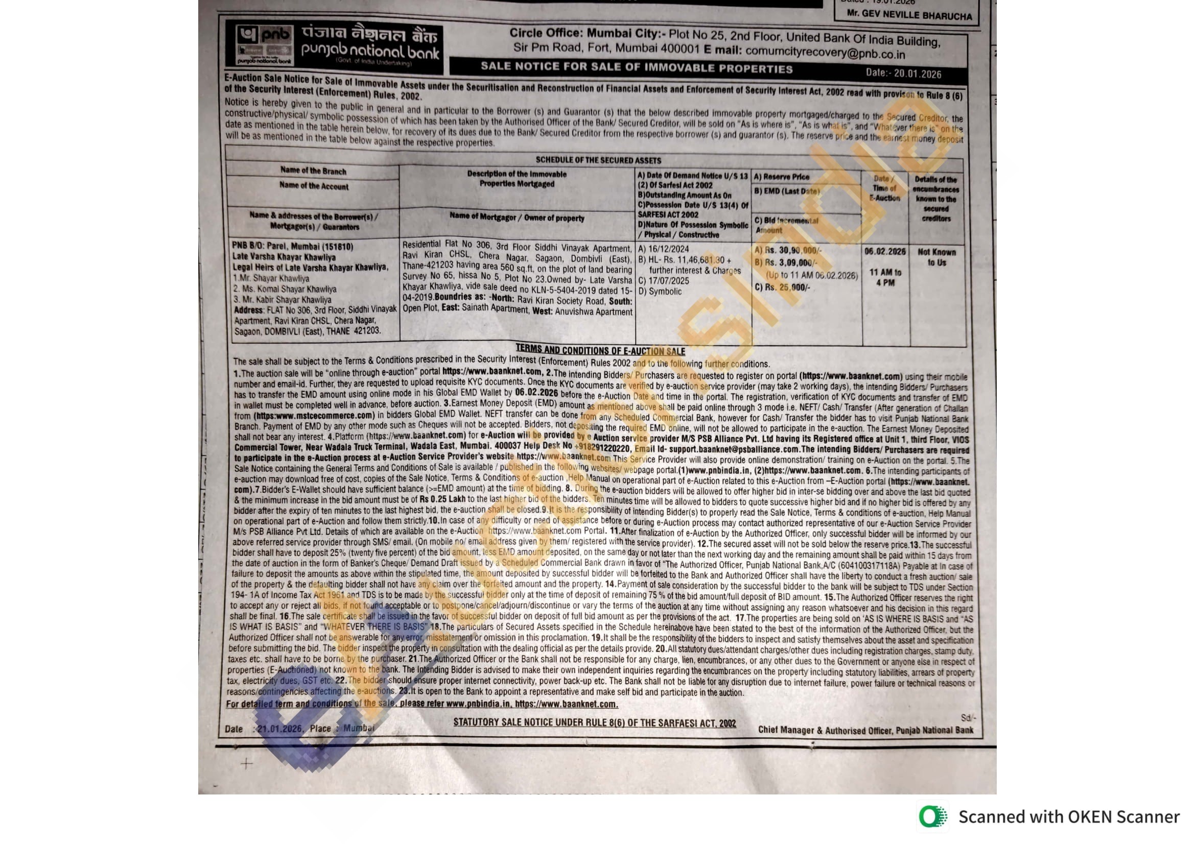 Residential Flat No 306, 3rd Floor Siddhi Vinayak Apartment. Ravi Kiran CHSL, Chera Nagar. Sagaon, Dombivli (East), Thane-421203 having area 560 sq.ft. on the plot of land bearing Survey No 65, hissa No 5. Plot No 23.Owned by- Late Varsha Khayar Khawliya, vide sale deed no KLN-5-5404-2019 dated 15-04-2019.Boundries as: -North: Ravi Kiran Society Road, South: Open Plot, East: Sainath Apartment, West: Anuvishwa Apartment