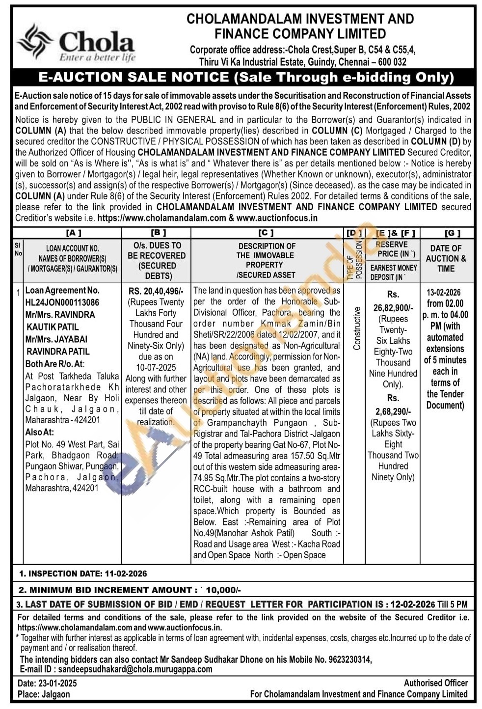 The land in question has been approved as per the order of the Honorable Sub-Divisional Officer, Pachora, bearing the order number Kmmak Zamin/Bin Sheti/SR/22/2006 dated 12/02/2007, and it has been designated as Non-Agricultural (NA) land. Accordingly, permission for Non-Agricultural use has been granted, and layout and plots have been demarcated as per this order. One of these plots is described as follows: All piece and parcels of property situated at within the local limits of Grampanchayth Pungaon Sub-Rigistrar and Tal-Pachora District-Jalgaon of the property bearing Gat No-67, Plot No-49 Total admeasuring area 157.50 Sq.Mtr out of this western side admeasuring area-74.95 Sq.Mtr. The plot contains a two-story RCC-built house with a bathroom and toilet, along with a remaining open space. Which property is Bounded as Below. East-Remaining area of Plot No.49(Manohar Ashok Patil) South :-Road and Usage area West:- Kacha Road and Open Space North: Open Space