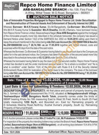 DESCRIPTION OF THE PROPERTY: All that piece and parcel of property bearing site No.3, formed in property assessment No. 111/5, situated at Nelagadaranahalli Village, Yeshwanthpur Hobli, Bengaluru North Taluk, presently comes under the limits of BBMP bearing Khata No 166 measuring East to West 50 Feet, North to South 25 Feet totally measuring 1250 Sq.ft., and Bounded on:- East by: Remaining property of E-Schedule, West by Road, North by Kushal Kumar's property, South by: Remaining Property of Hanumanthalah