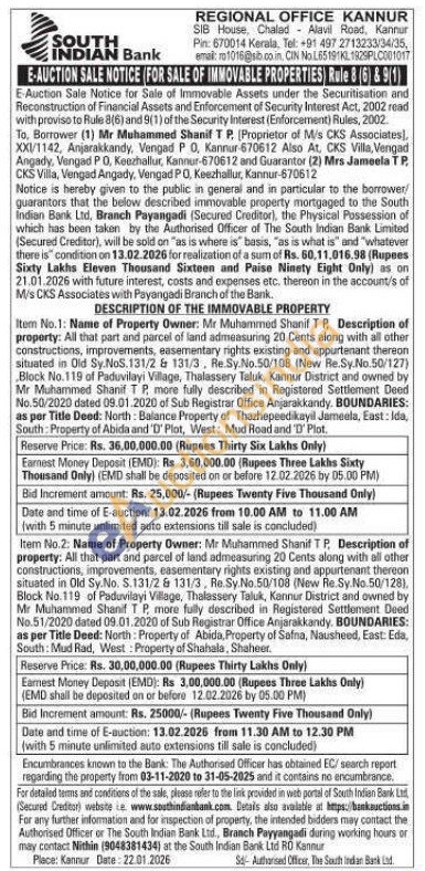 DESCRIPTION OF THE IMMOVABLE PROPERTY : Item No.2: Name of Property Owner: Mr Muhammed Shanif TP. Description of property: All that part and parcel of land admeasuring 20 Cents along with all other constructions, improvements, casementary rights existing and appurtenant thereon situated in Old Sy.No. S.131/2 & 131/3, Re Sy. No.50/108 (New Re.Sy.No.50/128). Block No.119 of Paduvilayi Village, Thalassery Taluk, Kannur District and owned by Mr. Muhammed Shanif TP, more fully described in Registered Settlement Deed No.51/2020 dated 09.01.2020 of Sub Registrar Office Anjarakkandy. BOUNDARIES: as per Title Deed: North: Property of Abida Property of Safna, Nausheed, East: Eda, South: Mud Rad, West Property of Shahala, Shaheer