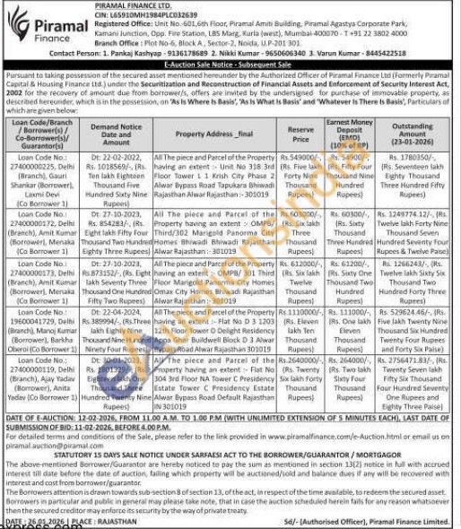 5) All The piece and Parcel of the Property having an extent Flat No 304 3rd Floor NA Tower C Presidency Estate Tower C Presidency Estate Alwar lypass Road Default Rajsthan IN301019