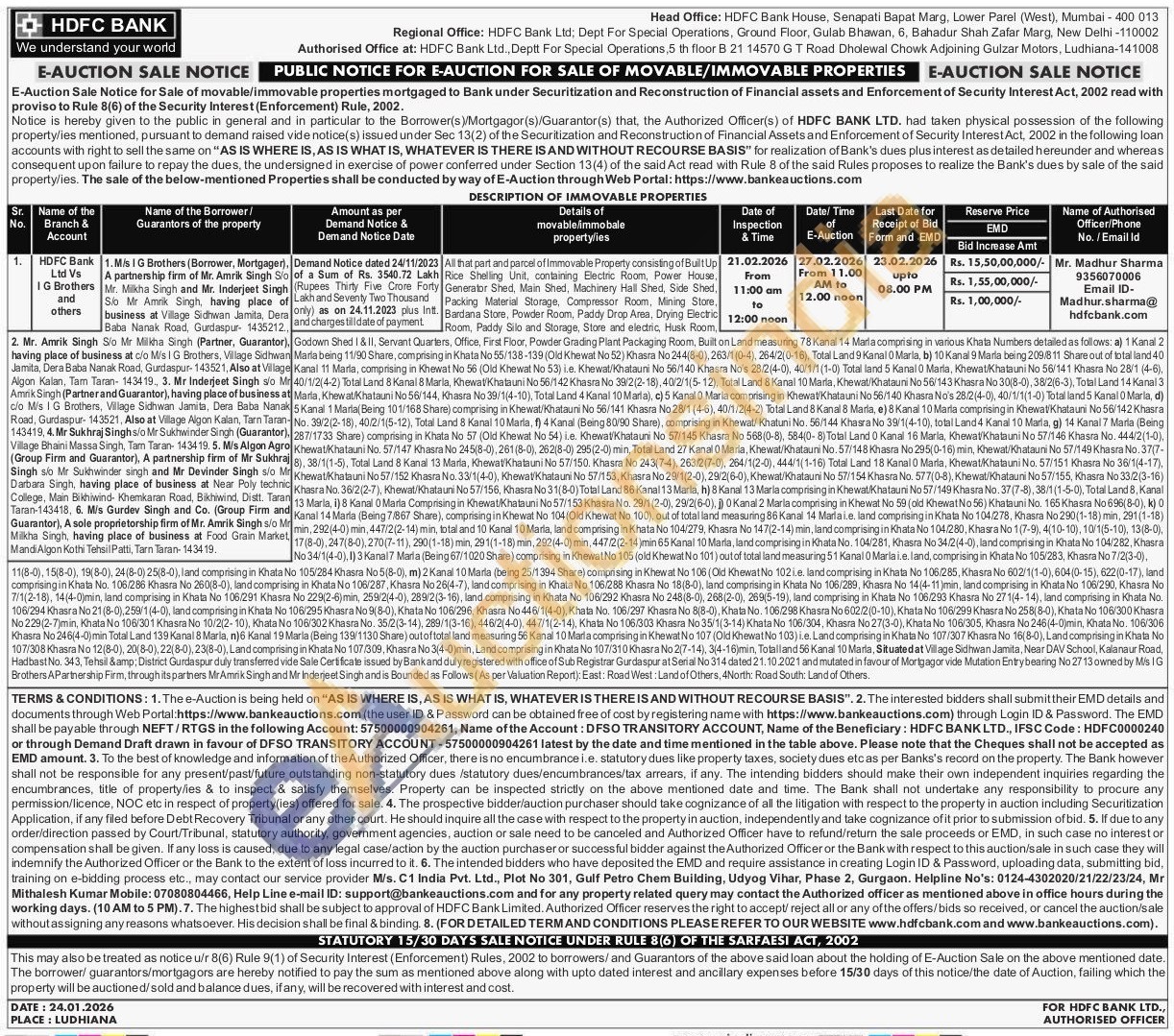 All that part and parcel of Immovable Property consisting of Built Up Rice Shelling Unit, containing Electric Room, Power House Generator Shed, Main Shed, Machinery Hall Shed, Side Shed Packing Material Storage, Compressor Room, Mining Store, Bardana Store, Powder Room, Paddy Drop Area, Drying Electric Room, Paddy Silo and Storage, Store and electric, Husk Room Godown Shed I & II, Servant Quarters, Office, First Floor, Powder Grading Plant Packaging Room, Built on Land measuring 78 Kanal 14 Marla comprising in various Khata Numbers detailed as follows: a) 1 Kanal 2 Maria being 11/90 Share, comprising in Khata No 55/138-139 (Old Khewat No 52) Khasra No 244(8-0), 263/1 (0-4), 264/2(0-16), Total Land 9 Kanal 0 Maria, b) 10 Kanal 9 Marla being 209/811 Share out of total land 40 Kanal 11 Maria, comprising in Khewat No 56 (Old Khewat No 53) Le. Khewat/Khatauni No 56/140 Khasra No's 28/2(4-0), 40/1/1(1-0) Total land 5 Kanal 0 Marla, Khewat/Khatauni No 56/141 Khasra No 28/1 (4-6) 40/1/2(4-2) Total Land 8 Kanal 8 Maria, Khewat Khatauni No 56/142 Khasra No 39/2(2-18), 40/2/1(5-12), Total Land 8 Kanal 10 Marla, Khewat/Khatauni No 56/143 Khasra No 30(8-0), 38/2(6-3), Total Land 14 Kanal 3 Marla, Khewat/Khatauni No 56/144, Khasra No 39/1(4-10), Total Land 4 Kanal 10 Maria), c) 5 Kanal 0 Marla comprising in Khewat Khatauni No 56/140 Khasra No's 28/2(4-0), 40/1/1(1-0) Total land 5 Kanal 0 Maria, d) 5 Kanal 1 Marla (Being 101/168 Share) comprising in Khewat/Khatauni No 56/141 Khasra No 28/1 (4-6), 40/1/2(4-2) Total Land 8 Kanal 8 Maria, e) 8 Kanal 10 Marla comprising in Khewat Khatauni No 56/142 Khasra No. 39/2(2-18), 40/2/1(5-12), Total Land 8 Kanal 10 Marla, f) 4 Kanal (Being 80/90 Share), comprising in Khewat/Khatuni No. 56/144 Khasra No 39/1(4-10), total Land 4 Kanal 10 Marla, g) 14 Kanal 7 Marla (Being 287/1733 Share) comprising in Khata No 57 (Old Khewat No 54) Le. Khewat Khatauni No 57/145 Khasra No 568(0-8), 584(0-8) Total Land 0 Kanal 16 Marla, Khewat Khatauni No 57/146 Khasra No. 444/2(1-0), Khewat/Khatauni No. 57/147 Khasra No 245(8-0), 261(8-0), 262(8-0) 295(2-0) min, Total Land 27 Kanal 0 Marla, Khewat/Khatauni No. 57/148 Khasra No 295(0-16) min, Khewat/Khatauni No 57/149 Khasra No. 37(7-8), 38/1(1-5), Total Land 8 Kanal 13 Marla, Khewat Khatauni No 57/150. Khasra No 243(7-4), 263/2(7-0), 264/1(2-0), 444/1(1-16) Total Land 18 Kanal 0 Marla, Khewat/Khatauni No. 57/151 Khasra No 36/1(4-17), Khewat Khatauni No 57/152 Khasra No. 33/1(4-0), Khewat Khatauni No 57/153, Khasra No 29/1(2-0), 29/2(6-0), Khewat/Khatauni No 57/154 Khasra No. 577(0-8), Khewat/Khatauni No 57/155, Khasra No 33/2(3-16) Khasra No. 36/2(2-7), Khewat/Khatauni No 57/156, Khasra No 31(8-0) Total Land 86 Kanal 13 Marla, h) 8 Kanal 13 Marla comprising in Khewat Khatauni No 57/149 Khasra No. 37(7-8), 38/1(1-5-0), Total Land 8, Kanal 13 Marla, i) 8 Kanal 0 Maria Comprising in Khewat/Khatauni No 57/153 Khasra No. 29/1 (2-0). 29/2(6-0), ]) 0 Kanal 2 Marla comprising in Khewat No 59 (old Khewat No 56) Khatauni No. 165 Khasra No 696(8-0), k) 0 Kanal 14 Maria (Being 7/867 Share), comprising in Khewat No 104 (Old Khewat No 100), out of total land measuring 86 Kanal 14 Martai.e. land comprising in Khata No 104/278, Khasra No 290(1-18) min, 291(1-18) min, 292 (4-0) min, 447/2(2-14) min, total and 10 Kanal 10 Maria, land comprising in Khata No 104/279, Khasra No 147(2-14) min, land comprising in Khata No 104/280, Khasra No 1 (7-9), 4(10-10), 10/1(5-10), 13(8-0), 17(8-0),247(8-0),270(7-11), 290(1-18) min, 291(1-18) min, 292(4-0) min, 447/2(2-14) min 65 Kanal 10 Marla, land comprising in Khata No. 104/281, Khasra No 34/2(4-0), land comprising in Khata No 104/282, Khasra No 34/1(4-0), 1) 3 Kanal7 Maria (Being 67/1020 Share) comprising in Khewat No 105 (old Khewat No 101) out of total land measuring 51 Kanal 0 Marlai.e. land, comprising in Khata No 105/283, Khasra No 7/2(3-0),11(8-0), 158-0), 19(5-0), 24(8-0) 25(8-0), land comprising in Khata No 105/284 Khasra No 5(8-0)), m) 2 Kanal 10 Maria (being 25/1394 Share) comprising in Khewat No 106 (Old Khewat No 102 ie. land comprising in Khata No 106.285, Khasra No 602/1(1-0), 60410-15), 622(0-17), land comprising in Khata No. 106/286 Khasra No 250(8-0), land comprising in Khata No 106/287, Khasra No 26(4-7), land comprising in Khata No 106.288 Khasra No 18(8-0), land comprising in Khata No 106/289, Khasra No 14/4-11)min, land comprising in Khata No 106/290. Khasra No 7/1(2-18), 14(4-0)min, land comprising in Khata No 106291 Khasra No 229(2-6)min, 259/2(4-0), 289/2(3-16), land comprising in Khata No 106/292 Khasra No 248(8-0), 268(2-0), 26915-19), land comprising in Khata No 106.293 Khasra No 27 1/4-14), land comprising in Khata No. 106/294 Khasra No 21(8-0),250/1(4-0), land comprising in Khata No 106/295 Khasra No 9(8-0), Khata No 106/296, Khasra No 446/1(4-0), Khata No. 106/297 Khasra No 8(8-0), Khata No. 106/298 Khasra No 602/2(0-10), Khata No 105/299 Khasra No 258(8-0), Khata No 106/300 Khasra No 22912-7)min, Khata No 106/301 Khasra No 10/2(2-10), Khata No 106/302 Khasra No. 35/2(3-14), 289/1(3-16), 446/2(40) 447/1(2-14), Khata No 106/303 Khasra No 35/1(3-14) Khata No 106/304, Khasra No 27(3-0), Khata No 106/305, Khasra No 246(4-0)min, Khata No. 106/306 Khasra No.246(4-0)min Total Land 139 Kanal 8 Maria, një Kanal 19 Maria (Being 139/1130 Share) out of total land measuring 56 Kanal 10 Marla comprising in Kherwat No 107 (Old Khewat No 103) Le. Land comprising in Khata No 107/307 Khasira No 16(8-3), Land comprising in Khata No 107/308 Khasra No 12:8-0), 20(80), 22(8-0), 23/8-0), Land comprising in Khata No 107/309, Khasra No 3(4-0)min, Land comprising in Khata No 107/310 Khasra No 2(7-14), 3(4-16)min, Totalland 56 Kanal 10 Maria, Situated at Village Sidhwan Jamta, Near DAV School, Kalanaur Road, Hadbast No. 343, Tehsil & District Gurdaspur duly transfamed vide Sale Certificate issued by Bank and duly registered with office of Sub Registrar Gurdaspur at Serial No 314 dated 21.10.2021 and mutated in