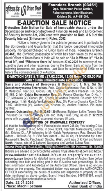 All that the house bearing (G+1 Floors) in site extent 246 Sq. Yds bearing D No. 1-107/1, at present D No. 1-107, in S No. 333/1, Near SBI, Mallavolu (V), Guduru (M), Krishna Dt., A.P. belonging to Mr. Gajula Venkateswara Rao. Ground floor extent 1020.65 Sq. Ft First floor extent 762.00 Sq. Ft Bounded by: East: Rajaveedhi, South: Panchayath Sandhu, West: Joint Way of K Ravi and Murali, North: House, site of G Lakshmi Narayana and Venkat Subba Rao