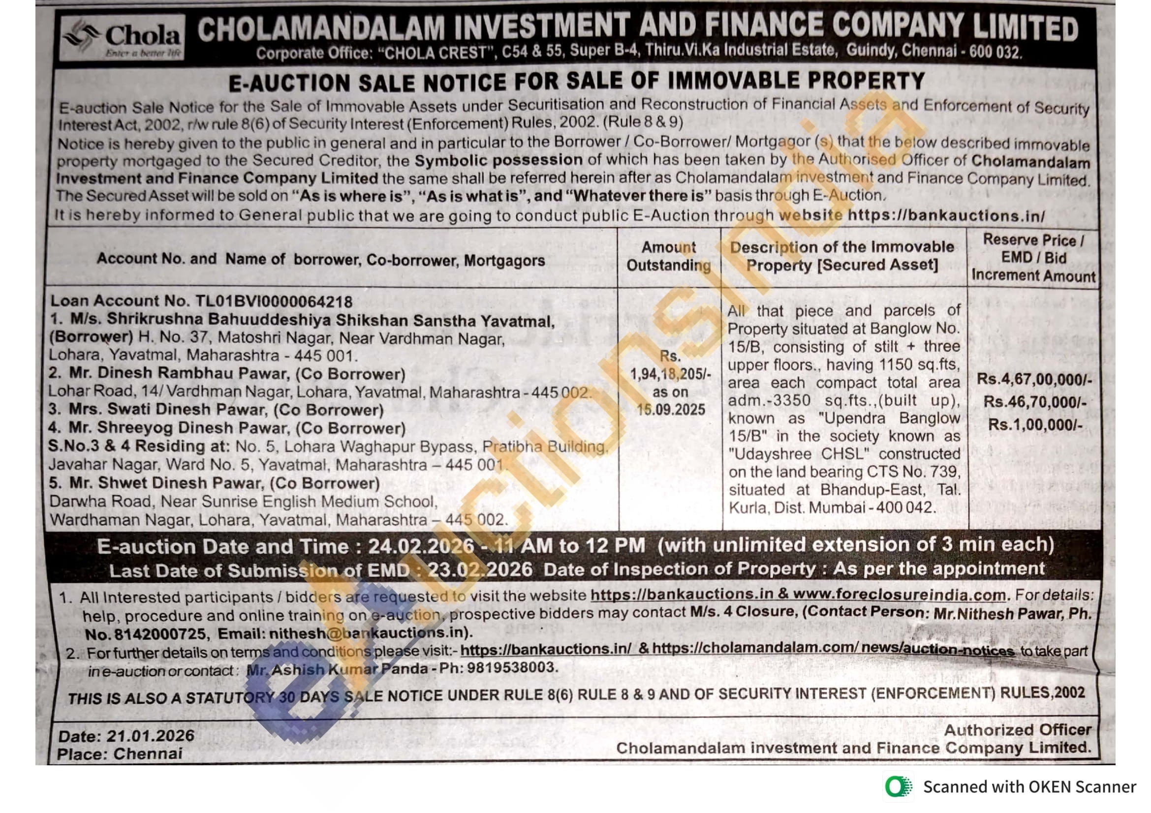 All that piece and parcels of Property situated at Banglow No. 15/B, consisting of stilt three upper floors., having 1150 sq.fts, area each compact total area adm.-3350 sq.fts., (built up), known as "Upendra Banglow 15/B" in the society known as "Udayshree CHSL constructed on the land bearing CTS No. 739, situated at Bhandup-East, Tal. Kurla, Dist. Mumbai-400042