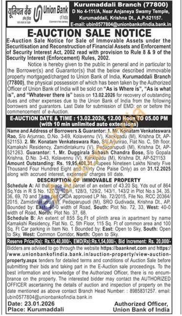 All that piece and parcel of an extent of 43.20 Sq. Yds out of 864 Sq. Yds in R S No. 127/3, 128/1, 128/3, 129/2, 143/1, 143/2 in Plot Nois 34, 35, 36, 69, 70 and 71 as per CRDA approved LP No. 72/2015, File No. RCC 20364/2015, Zamidintakurru (V), Pedaparupudi (M), SRO Gudivada, Krishna Dt., AP, Bounded by: East: 40-0 width of Road, South: Plot No. 72, 33, West: 40-0 width of Road, North: Plot No. 37, 68. Schedule B: An extent of 855 Sq.Ft of plinth area in apartment by name Kamakshi Residency, Flat No. C, 5th Floor, 115 Sq. Ft of common area and 100 Sq. Ft Car parking in Item No. 1 Bounded by: East: Open to Sky, South: Open to Sky, West: Common Corridor, North: Open to Sky