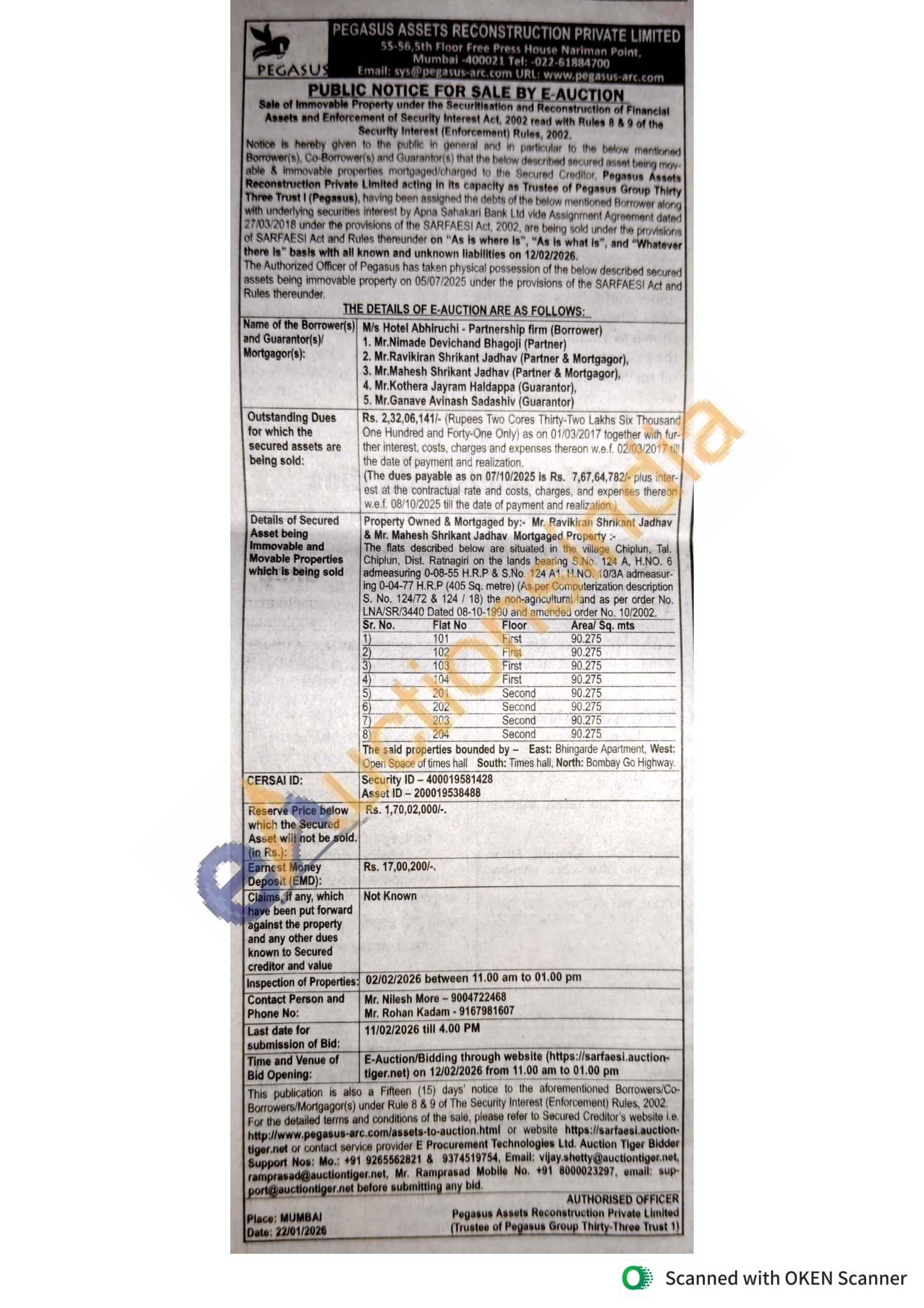Property Owned & Mortgaged by: Mr. Ravikiran Shrikant Jadhav & Mr. Mahesh Shrikant Jadhav Mortgaged Property:- The flats described below are situated in the village Chiplun, Tal. Chiplun, Dist. Ratnagiri on the lands bearing S.No. 124 Α, Η.ΝΟ. 6 admeasuring 0-08-55 H.R.P & S.No. 124 A1, H.NO. 10/3A admeasur-ing 0-04-77 H.R.P (405 Sq. metre) (As per Computerization description S. No. 124/72 & 124/18) the non-agricultural land as per order No. LNA/SR/3440 Dated 08-10-1990 and amended order No. 10/2002The said properties bounded by East: Bhingarde Apartment, West: Open Space of times hall South: Times hall, North: Bombay Go Highway