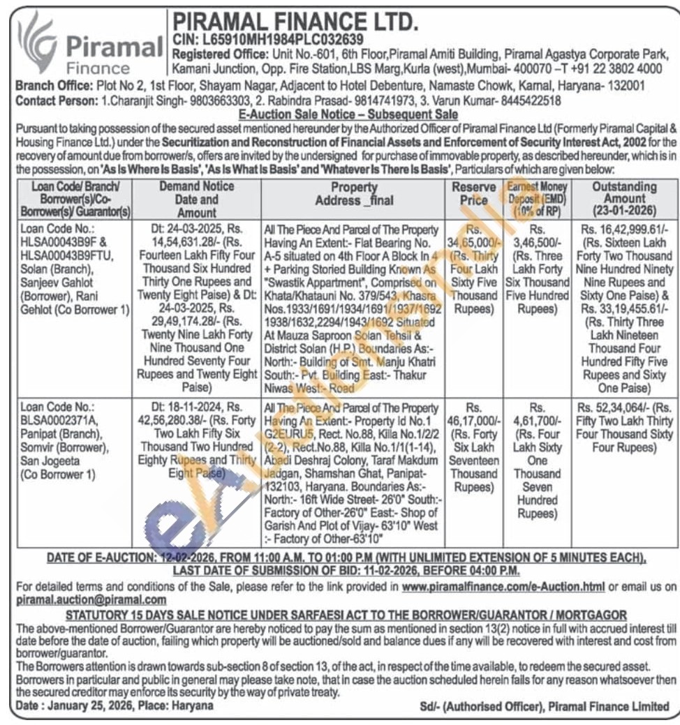 All The Piece And Parcel of The Property Having An Extent:- Flat Bearing No. A-5 situated on 4th Floor A Block In 4 + Parking Storied Building Known As "Swastik Appartment", Comprised on Khasra Khata/Khatauni No. No. 379/543, Kha Nos. 1933/1691/1934/1691/1937/1692 1938/1632,2294/1943/1692 Situated At Mauza Saproon Solan Tehsil & District Solan (H.P.) Boundaries As:-North:- Building of Smt. Manju Khatri South:- Pvt. Building East:- Thakur Niwas West:- Road