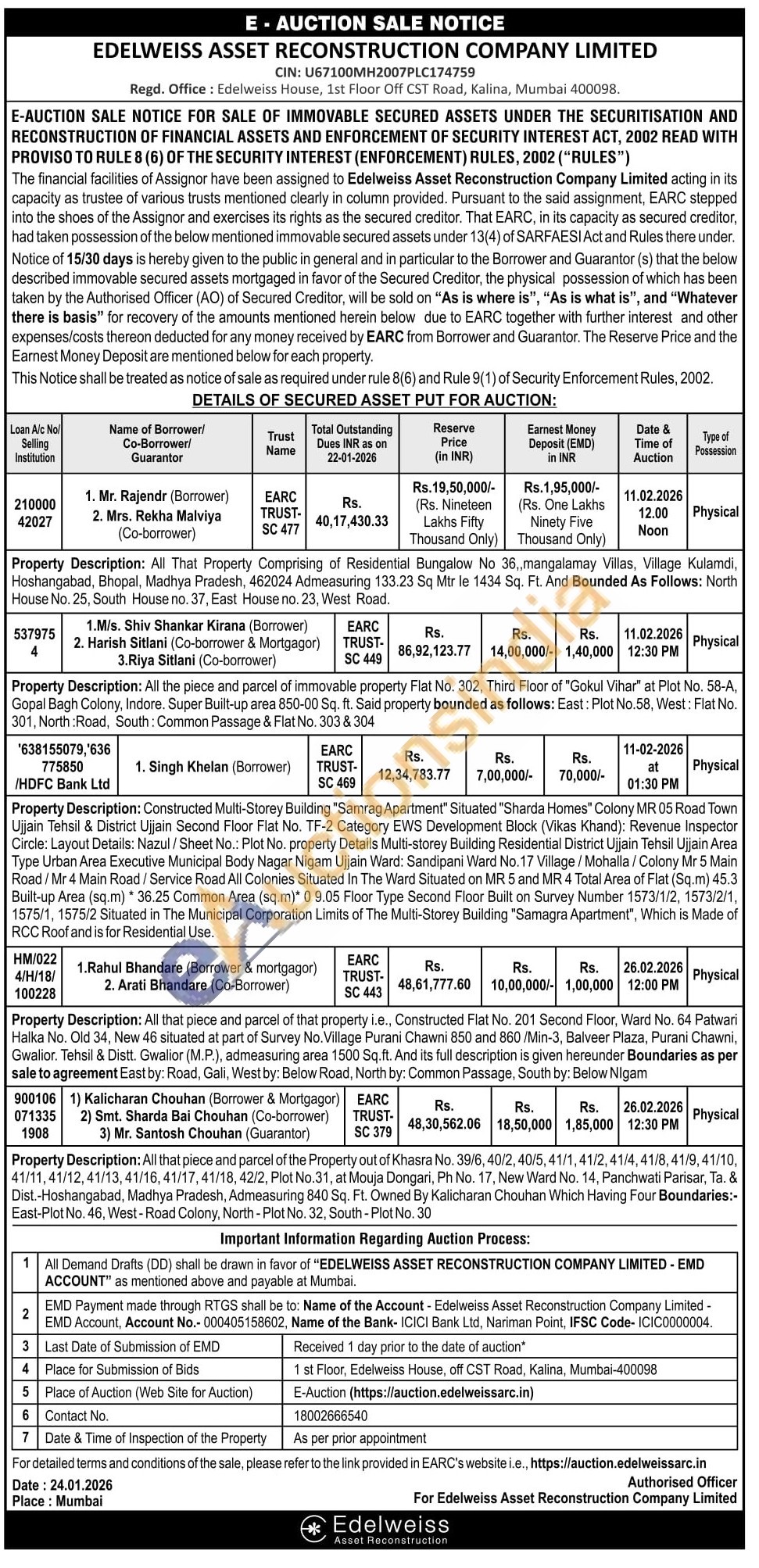 Property Description: All the piece and parcel of immovable property Flat No. 302, Third Floor of "Gokul Vihar" at Plot No. 58-A, Gopal Bagh Colony, Indore. Super Built-up area 850-00 Sq. ft. Said property bounded as follows: East: Plot No.58, West: Flat No. 301, North Road, South: Common Passage & Flat No. 303 & 304