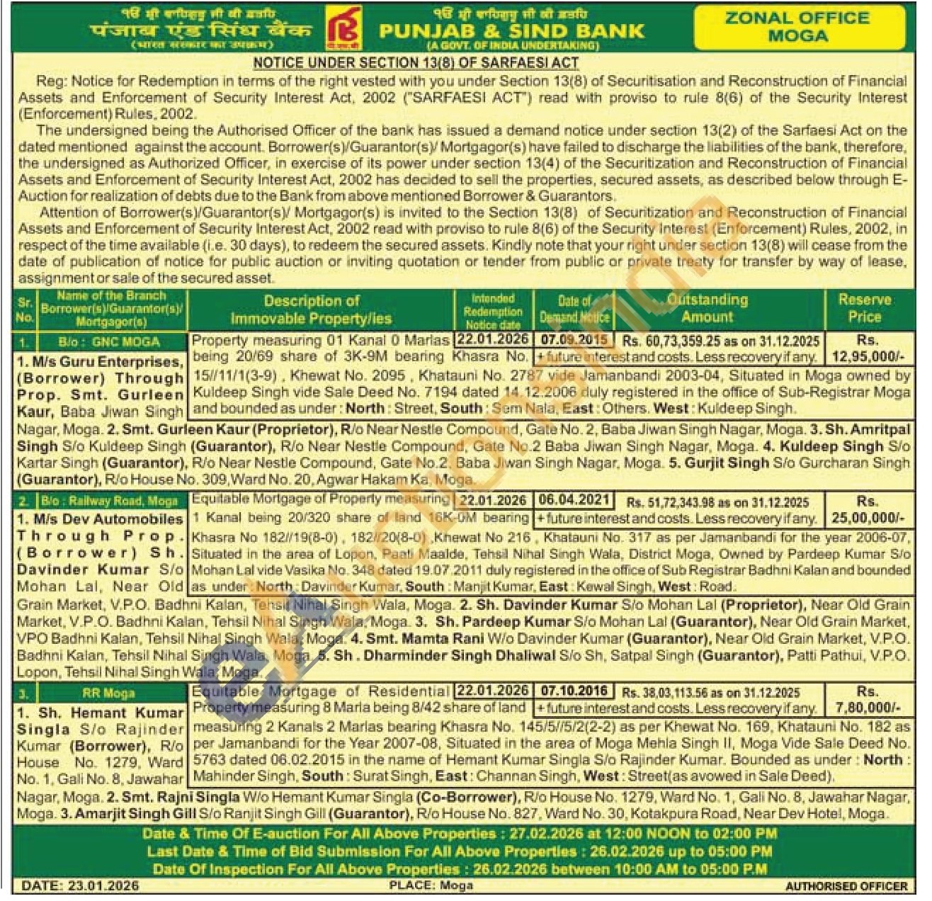 Property measuring 01 Kanal 0 Marias being 20/69 share of 3K-9M bearing 15/11/1(3-9), Khewat No. 2095, Khatauni No. 2787 vide Jamanbandi 2003-04, Situated in Moga owned by Kuldeep Singh vide Sale Deed No. 7194 dated 14.12.2006 duly registered in the office of Sub-Registrar Moga Singh and bounded as under: North: Street, South: Sem Nala, East: Others. West: Kuldeep Singh