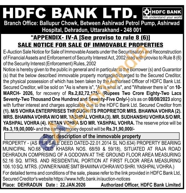 PROPERTY - (AS PER SALE DEED DATED-22.01.2014 SL NO.634) PROPERTY BEARING MUNICIPAL NO.68 (OLD KHASRA NOS. 68/59 & 59/18), SITUATED AT RAJA ROAD DEHRADUN COMPRISING OF A GODOWN AT THE GROUND FLOOR AREA MEASURING 52.16 SQ. MTRS. AND RESIDENTIAL PORTION AT FIRST FLOOR AREA MEASURING 106.10 SQ. MTRS. (OWNER NAME SMT BHAWNA VOHRA W/O SHRI. YASHPAL VOHRA.)