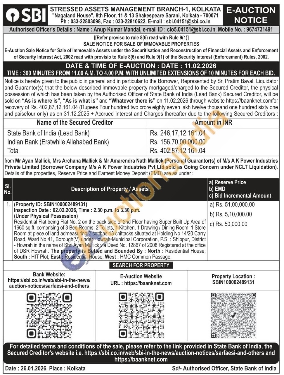Residential Flat being Flat No. 2 on the back side of 2nd Floor having Super Built Up Area of 1660 sq.ft. comprising of 3 Bed Rooms, 2 Toilets, 1 Kitchen, 1 Drawing / Dining Room, 1 Store Room at piece of land admeasuring 2 cotthas 13 chittacks situated at Holding No 14/20 Carry Road, Ward No 41, Borough (V) under Howrah Municipal Corporation, P.S.: Shibpur, District - Howrah in the name of Shri Ayan Mullick via Deed No. 12867 of 2008 Registered at the office of DSR Howrah. The property is Butted and Bounded By: North: Residential HouseSouth: HIT Plot; East: Residential House; West: HMC Common Passage.