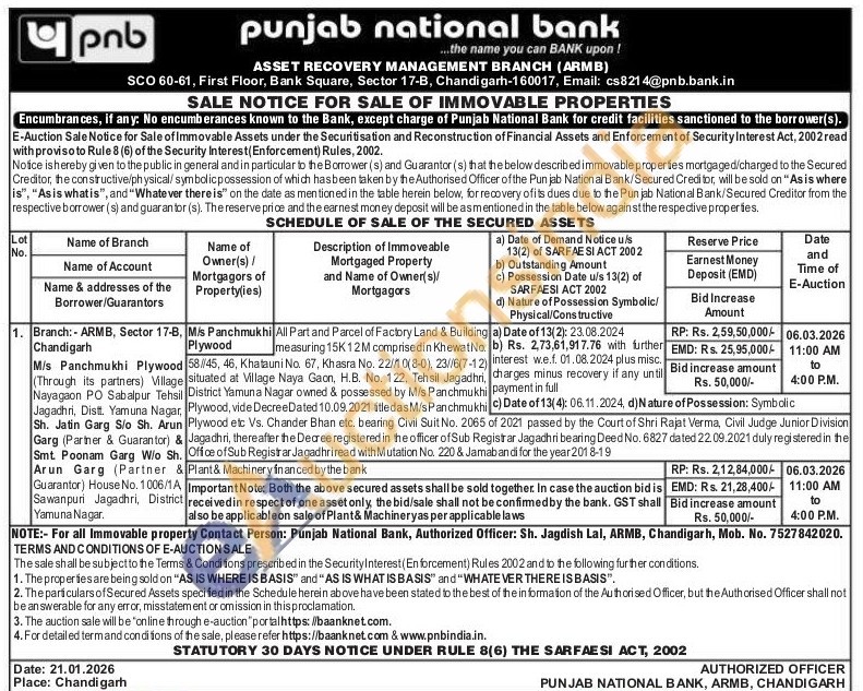 All Part and Parcel of Factory Land & Building measuring 15K 12M comprisedin Khewat No. 58/45, 46, Khatauni No. 67, Khasra No. 22/10(8-0), 23//6(7-12) situated at Village Naya Gaon, H.B. No. 122. Tehsil Jagadhri, District Yamuna Nagar owned & possessed by M/s Panchmukhi Plywood etc Vs. Chander Bhan etc. bearing Civil Suit No. 2065 of 2021 passed by the Court of Shri Rajat Verma, Civil Judge Junior Division Jagadhri, thereafter the Decree registered in the officer of Sub Registrar Jagadhri bearing Deed No. 6827 dated 22.09.2021 duly registered in the Office of Sub Registrar Jagadhriread with Mutation No. 220 & Jamabandi for the year 2018-19