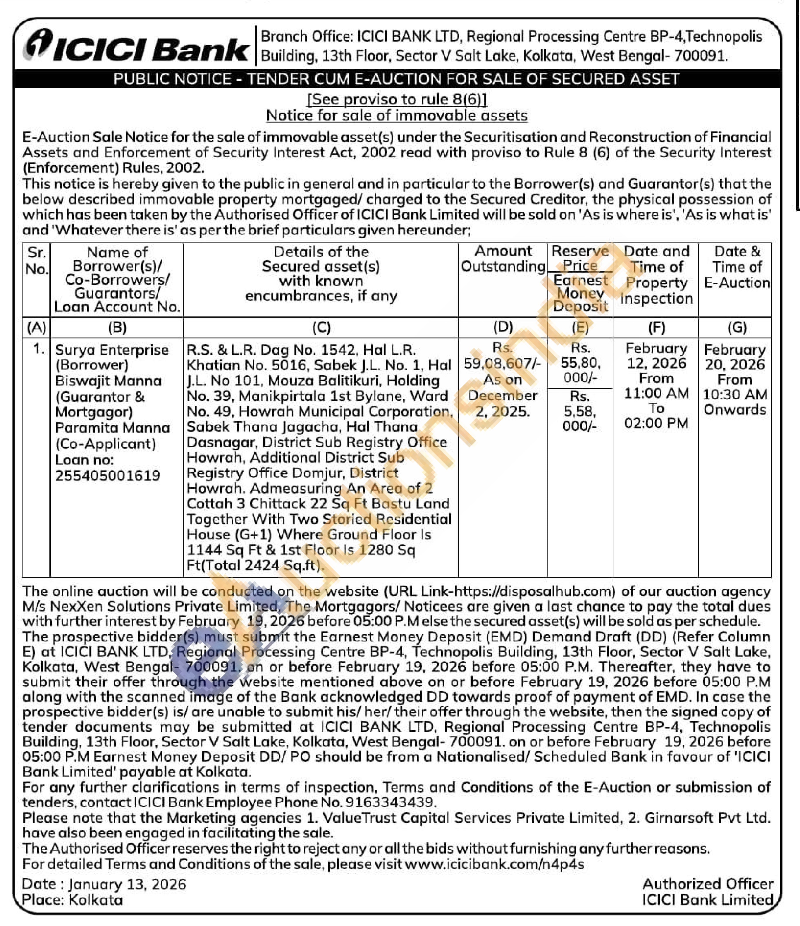 R.S. & L.R. Dag No. 1542, Hal L.R. Khatian No. 5016, Sabek J.L. No. 1, Hal J.L. No 101, Mouza Balitikuri, Holding No. 39, Manikpirtala 1st Bylane, Ward No. 49, Howrah Municipal Corporation, Sabek Thana Jagacha, Hal Thana Dasnagar, District Sub Registry Office Howrah, Additional District Sub Registry Office Domjur, District Howrah. Admeasuring An Area of 2 Cottah 3 Chittack 22 Sq Ft Bastu Land Together With Two Storied Residential House (G+1) Where Ground Floor is 1144 Sq Ft & 1st Floor Is 1280 Sq Ft(Total 2424 Sq.ft).