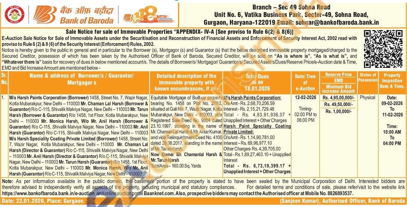 Equitable Mortgage of Built-up property bearing No. 1458 on Plot No. 2/112 situated at Gali No. 7, Wazir Nagar, Kotla Mubarakpur, New Delhi 110003, vide Registered Sale Deed No. 9904 dated 23.10.1997, standing in the name of Mr. Chaman Lal Harsh & Mr. Antar Kumar and vide Relinquishment Deed No. 4100 dated 26.08.2017, standing in the name of Mr. Tarun Harsh Now Owner Mr. Chamanlal Harsh & Mr. Tarun Harsh Total Area-160.00 Sq.