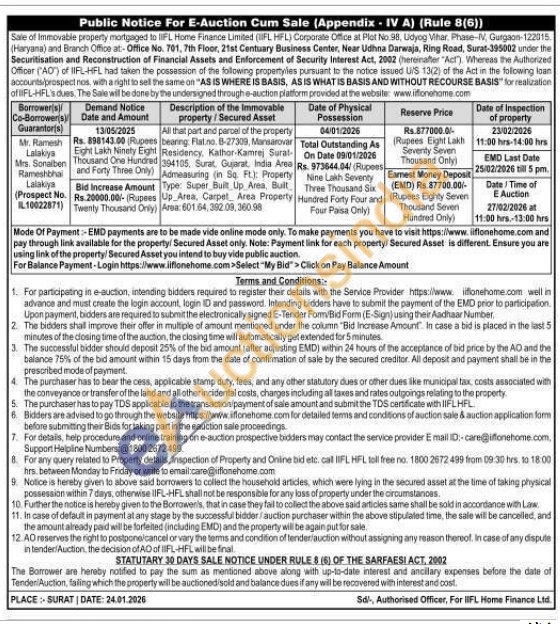 All that part and parcel of the property beanng. Flat.no. 8-27309, Marsarovar Residency, Kathor-Kamrej Surat 394105, Surat, Gujarat, India Area Admeasuring (in Sq. Ft): Property Type: Super Built Up Area, Bult Up Area, Carpet Area Property Area: 601.64,392.09,360.98