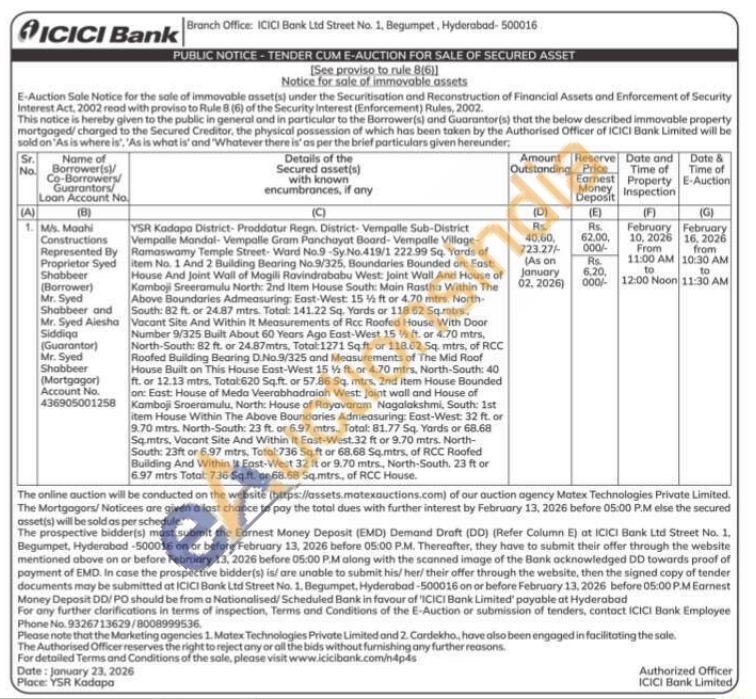 YSR Kadapa District- Proddatur Regn. District- Vempalle Sub-District Vempalle Mandal-Vempalle Gram Panchayat Board-Vempalle Village-Ramaswamy Temple Street Ward No.9-Sy No.419/1 222.99 Sq. Yards of item No. 1 And 2 Building Bearing No.9/325, Boundaries Bounded on: East: House And Joint Wall of Mogili Ravindrababu West: Joint Wall And House of Kamboji Sreeramulu North: 2nd Item House South: Main Rastho Within The Above Boundaries Admeasuring: East-West: 15 % ft or 4.70 mtrs. North-South: 82 ft. or 24.87 mtrs. Total: 141.22 Sq. Yards or 118.62 Sq.mtrs., Vacant Site And Within It Measurements of Rec Roofed House With Door Number 9/325 Built About 60 Years Ago East-West 15 % ft. or 4.70 mtrs, North-South: 82 ft. or 24.87mtrs, Total:1271 Sq.ft. or 118.62 Sq. mtrs, of RCC Roofed Building Bearing D.No.9/325 and Measurements of The Mid Roof House Built on This House East-West 15 % ft. or 4.70 mtrs, North-South: 40 ft. or 12.13 mtrs, Total: 620 Sq.ft. or 57.86 Sq. mtrs, 2nd Item House Bounded on: East: House of Meda Veerabhadraiah West: Joint wall and House of Kamboji Sroeramulu, North: House of Rayavaram Nagalakshmi, South: 1st item House Within The Above Boundaries Admeasuring: East-West: 32 ft. or 9.70 mtrs. North-South: 23 ft. or 6.97 mtrs., Total: 81.77 Sq. Yards or 68.68 Sq.mtrs. Vacant Site And Within It East-West 32 ft or 9.70 mtrs. North-South: 23ft or 6.97 mtrs, Total: 736 Sq.ft or 68.68 Sq.mtrs, of RCC Roofed Building And Within It East-West 32 ft or 9.70 mtrs, North-South. 23 ft or 6.97 mtrs Total: 736 Sq.ft. or 68.68 Sq.mtrs, of RCC House