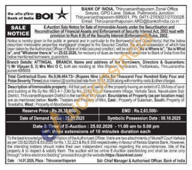 Description of Immovable property: Al that part and parcel of the property having an extent 2.09-Aresofand and building at Ra Sy No: 562-4-1 (Dkt Sy No 2330/1/1) of Karavanam Village, Varkala Tatuk, Nuvakulam Sub Dwtrict, Thiruvananthapuram District in the name of ir Visyan Boundaries of Property (as per location map) are as mentioned below: North: Thadam and Property of Sins, East: Property of Sulaman, South: Property of Sreelatha, Weat: Property of Aboobekar