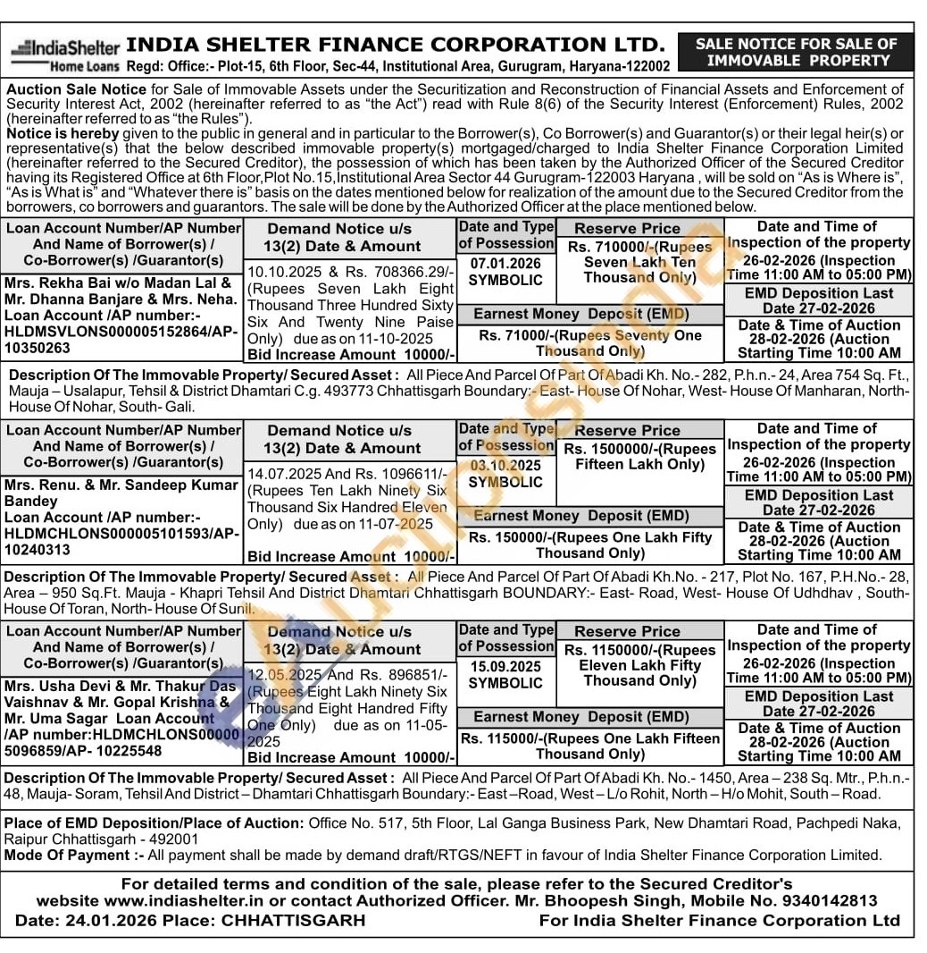 Description Of The Immovable Property/ Secured Asset: All Piece And Parcel Of Part Of Abadi Kh. No. - 217, Plot No. 167, P.H.No.- 28, Area-950 Sq. Ft. Mauja Khapri Tehsil And District Dhamtari Chhattisgarh BOUNDARY:- East- Road, West- House Of Udhdhav, South-House Of Toran, North-House Of Sunil