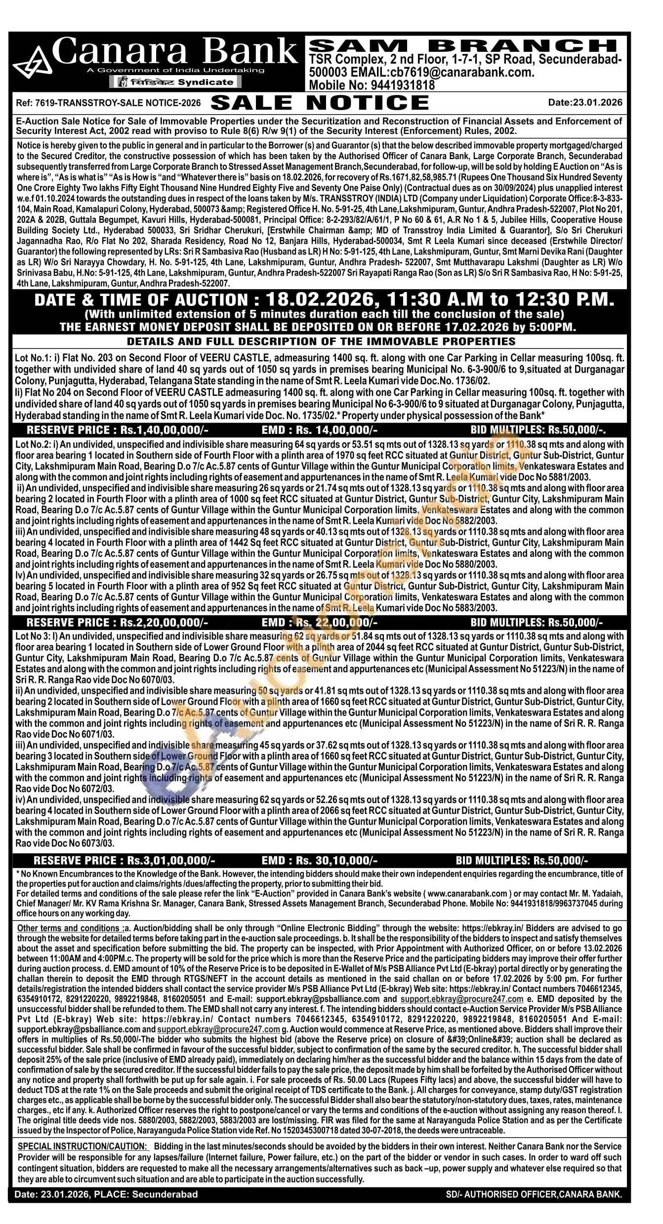 Flat No. 203 on Second Floor of VEERU CASTLE, admeasuring 1400 sq. ft. along with one Car Parking in Cellar measuring 100sq. ft. together with undivided share of land 40 sq yards out of 1050 sq yards in premises bearing Municipal No. 6-3-900/6 to 9, situated at Durganagar Colony, Punjagutta, Hyderabad, Telangana State standing in the name of Smt R. Leela Kumari vide Doc. No. 1736/02. li) Flat No 204 on Second Floor of VEERU CASTLE admeasuring 1400 sq. ft. along with one Car Parking in Cellar measuring 100sq. ft. together with undivided share of land 40 sq yards out of 1050 sq yards in premises bearing Municipal No 6-3-900/6 to 9 situated at Durganagar Colony, Punjagutta, Hyderabad standing in the name of Smt R. Leela Kumari vide Doc. No. 1735/02.* Property under physical possession of the Bank