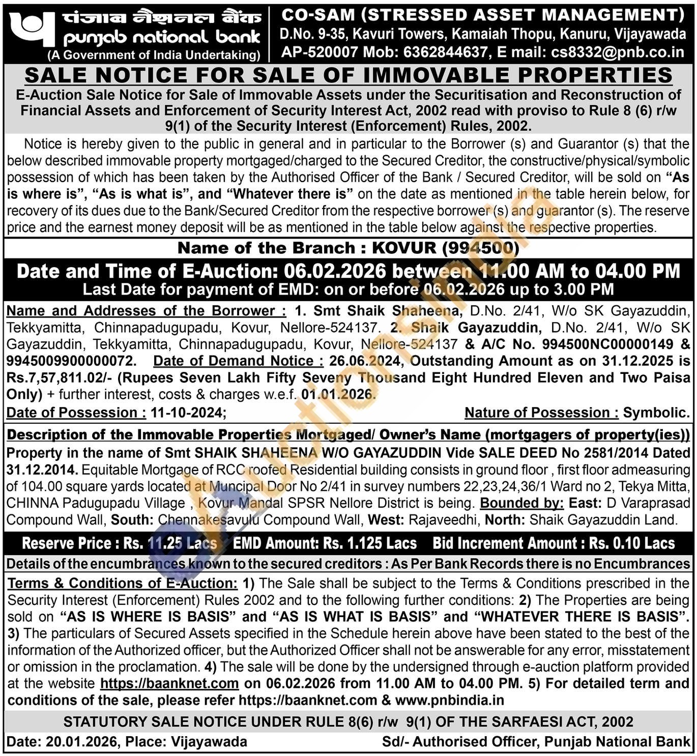 Description of the Immovable Properties Mortgaged/ Owner's Name (mortgagers of property(ies)) Property in the name of Smt SHAIK SHAHEENA W/O GAYAZUDDIN Vide SALE DEED No 2581/2014 Dated 31.12.2014. Equitable Mortgage of RCC roofed Residential building consists in ground floor, first floor admeasuring of 104.00 square yards located at Muncipal Door No 2/41 in survey numbers 22,23,24,36/1 Ward no 2, Tekya Mitta, CHINNA Padugupadu Village, Kovur Mandal SPSR Nellore District is being. Bounded by: East: D Varaprasad Compound Wall, South: Chennakesavulu Compound Wall, West: Rajaveedhi, North: Shaik Gayazuddin Land