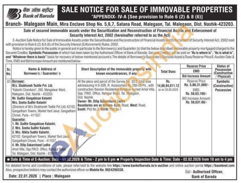 All the piece and parcel of the Survey No. 32/2, total area admeasuring H.0-35R, R. Assessment Rs.280-00 Ps, with construction thereon Residential Bunglow named Amol Villa, Opp. PWD. Office, Nampur Road, Tal. Malegaon,Owner- Mr. Dilip Sakarchand Lodha Nashik