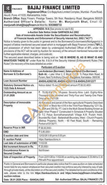 All that piece and parcel of the Non-agricultural Property Described As-Flat in 'e' Block No-4-016 in the Third Floor Measuring 12118q. FL. SBA and 250 Sq. FT. Usd in the Multi Stored Building Known as Make Whar Phase- Constructed in Schedule A Property Situated at TC Palya Sonnathamanahalli Village K.R. Puram Hobli Bounded By-East:-Battarahalli Boundary, West Church Property (Bishop Property). North: 60 Feet Road, South: Remaining Portion of SY 50/11