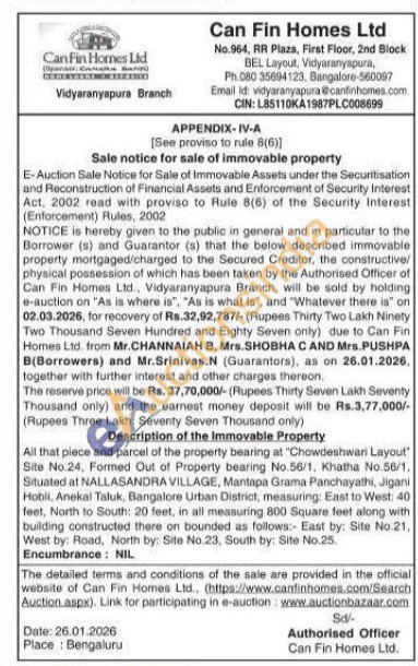 All that piece and parcel of the property bearing at "Chowdeshwari Layout" Site No.24. Formed Out of Property bearing No.56/1, Khatha No.56/1. Situated at NALLASANDRA VILLAGE, Mantapa Grama Panchayathi, Jigani Hobli, Anekal Taluk, Bangalore Urban District, measuring: East to West: 40 feet, North to South: 20 feet, in all measuring 800 Square feet along with building constructed there on bounded as follows: East by: Site No.21. West by: Road, North by: Site No.23, South by: Site No.25.