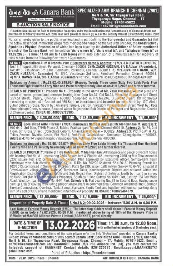 Property No.1: (Property in the name of Mr. Zakir Hussain), All that piece and parcel of house, ground and premises bearing New Door No.37. Old No.21, Varasidhi Vinayagar koil Street (VWKoil street), Vepery, Chennal 600003, comprised in R.S.No.246, O.S.No.610 part, CC No.3678/A measuring an extent of 1 Ground and 455 Sq.ft. or thereabouts and bounded on the North by: S.T. Abdul Suhur Saheb's House, South by Anjaneya Temple, East by: Varasidhi Vinayagar Koil Street, West by: Kota Munirathinam Chetty's house, Situated within Registration Sub District of Periamet and Registration District of Chennai Central CERSAI ID: 400055723305