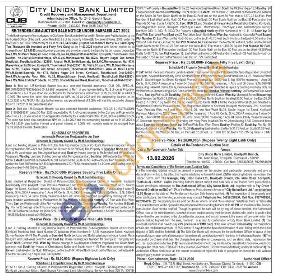 3) Land & Building situated at Registration District of Palayamkottai, Sub-Registration District of Kovilpat, Kovilpatti Municipal limit, Ward Number-20 (previous Ward Numbers-9,16,18), Kassukarar Street. Kovilpatti Survey Number 444/1 The Property is Bounded North by: Land and Buliding belongs to Nadar Uravin Murai Sangam and East-West common wall, East by: House bearing Door Number 19 belongs to Thangaraj and South-North Common Wall, West by: House belongs to Axudaiappan Chettiyar Vagaiyara and South-North common wall South by: House of Chinnasamy Nadar and South-North 4 1/2 Feet wide common pathway Extent: East-West on the North 10 Feet and on the South- 1/4 Feet North-South on the West and on the East-44 Feet that is 423.50 Sq. ft equal to 39.34 Sq meter