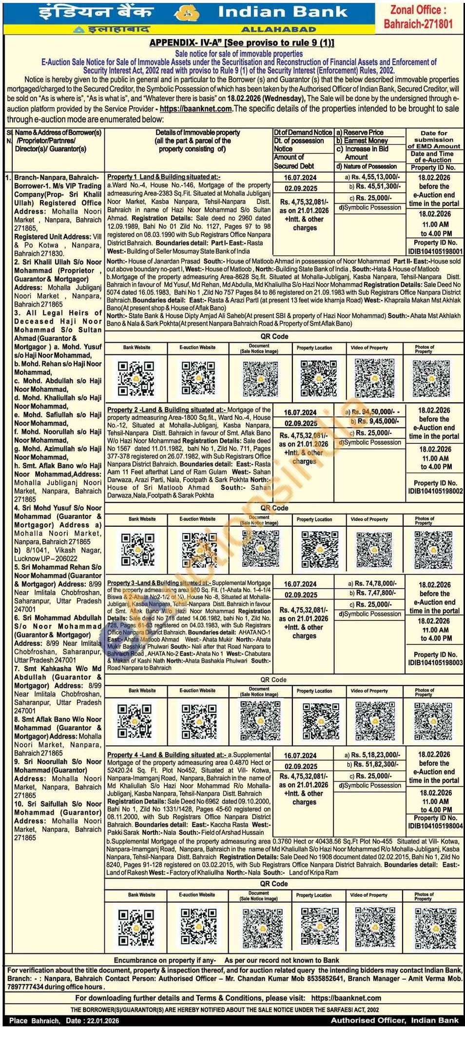 -Land & Building situated at:- a. Supplemental Mortgage of the property admeasuring area 0.4870 Hect or 52420.24 Sq. Ft. Plot No452, Situated at Vill- Kotwa, Nanpara-Imamganj Road, Nanpara, Bahraich in the name of Md Khaliullah S/o Hazi Noor Mohammad Rio Mohalla-Jubliganj, Kasba Nanpara, Tehsil-Nanpara Distt. Bahraich r Registration Details: Sale Deed No 6962 dated 09.10.2000, Bahi No 1, Zild No 1331/1428, Pages 45-60 registered on 08.11.2000, with Sub Registrars Office Nanpara District Bahraich. Boundaries detail: East:- Kaccha Rasta West:-Pakki Sarak North:-Nala South:- Field of Arshad Hussain
