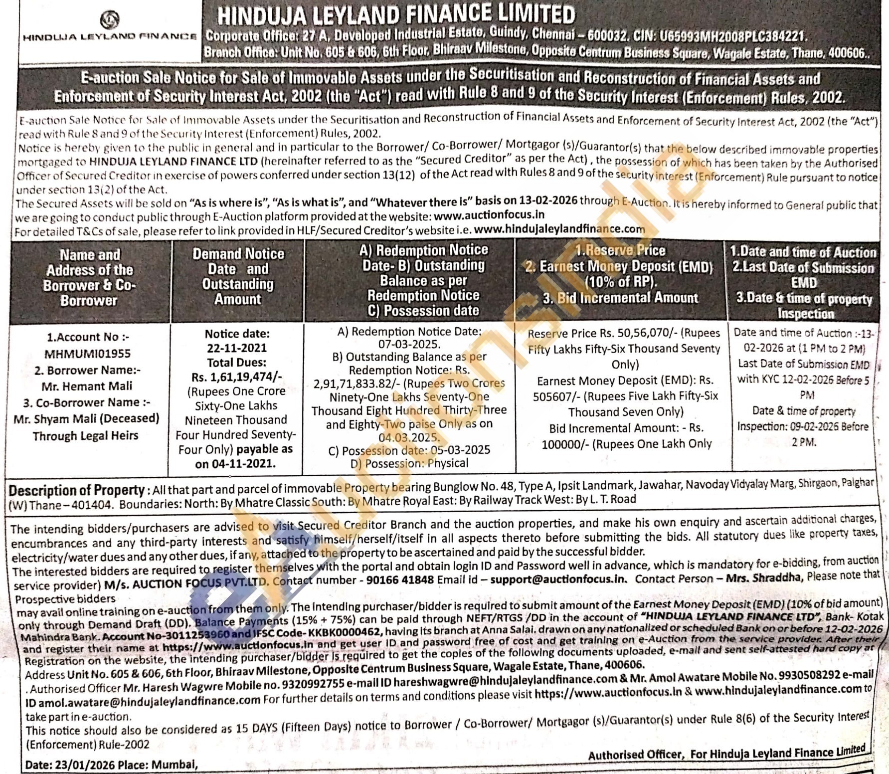 Authorised Officer Mr. Haresh Wagwre Mobile no : 9320992755 / Mr. Amol Awatare Mobile No : 9930508292
