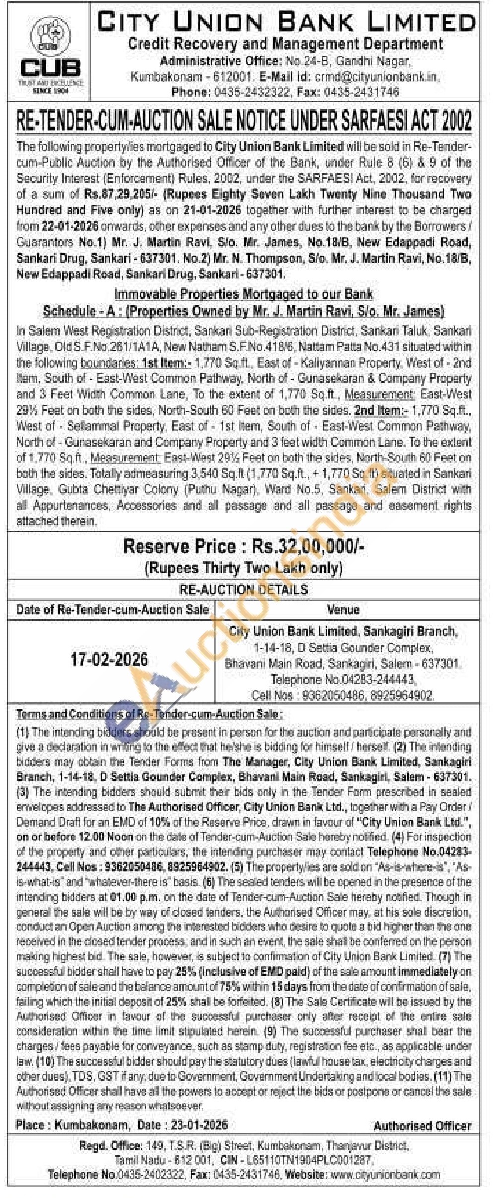 In Salem West Registration District, Sankari Sub-Registration District, Sankari Taluk, Sankari Village, Old S.F.No.261/1A1A, New Natham S.F.No.418/6, Nattam Patta No.431 situated within the following boundaries: 1st Item:- 1,770 Sq.ft., East of Kaliyannan Property, West of 2nd item, South of East-West Common Pathway, North of Gunasekaran & Company Property and 3 Feet Width Common Lane, To the extent of 1,770 Sq.ft., Measurement East-West 29% Feet on both the sides, North-South 50 Feet on both the sides. 2nd Item:- 1,770 Sq.ft., West of Sellammal Property. East of 1st Item, South of East-West Common Pathway, North of Gunasekaran and Company Property and 3 feet width Common Lane. To the extent of 1,770 Sq.ft., Measurement, East-West 29% Feet on both the sides, North-South 60 Feet on both the sides. Totally admeasuring 3,540 Sq.lt (1,770 Sq.ft., 1,770 Sq.ft) situated in Sankari Village, Gubta Chettyar Colony (Puthu Nagar), Ward No.5. Sankari, Salem District with all Appurtenances, Accessories and all passage and all passage and easement rights attached therein